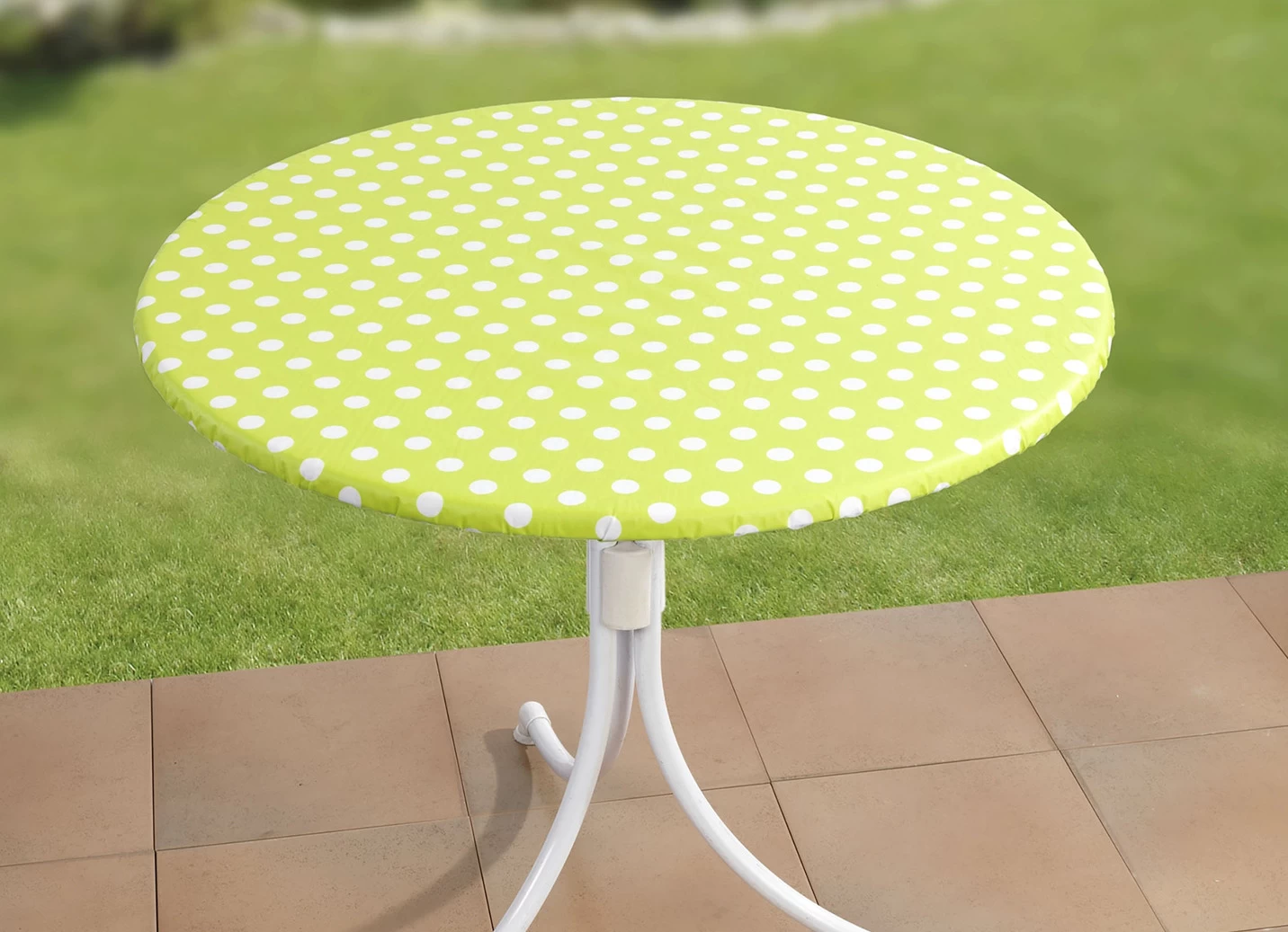 Die Spann-Tischdecke mit Punkte-Dessin passt sich perfekt dem Tisch an und schützt ihn vor Schmutz und Flecken. Einfach über den Tischrand ziehen. Dank integriertem Gummiband bleibt die Decke immer glatt, ohne zu verrutschen.