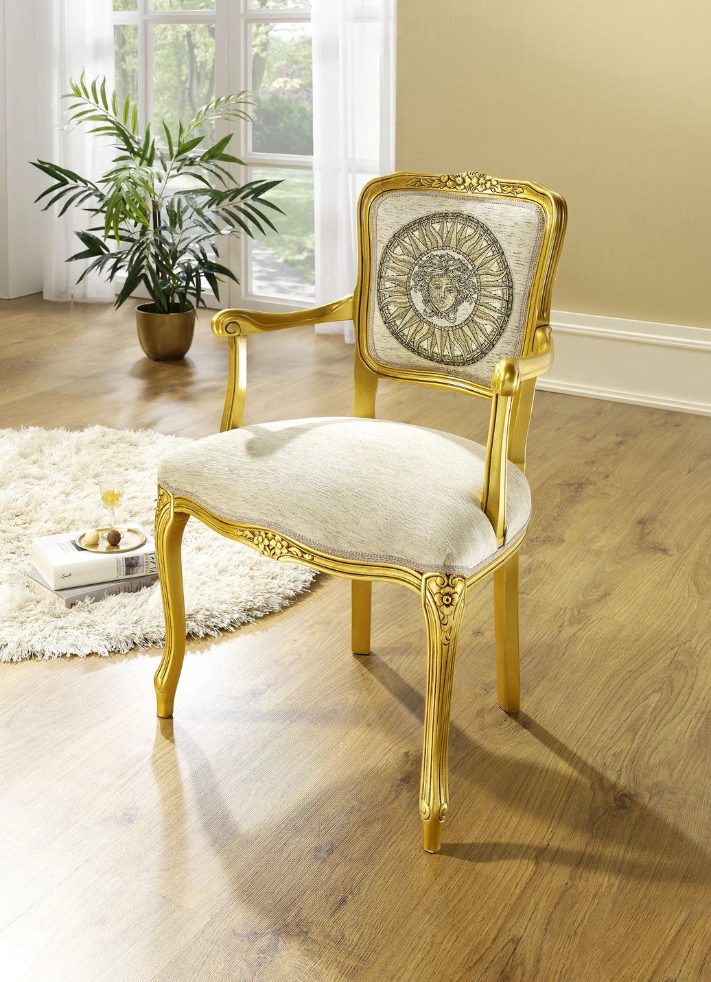 Sitzen wie auf einem Thron werden Sie auf diesem kunstvoll gefertigten Armlehnenstuhl! Geschwungene, mit Schnitzereien verzierte, goldfarben lackierte Beine sowie mit Federkernpolsterung gearbeitete Sitzfläche. Rückenlehne und Sitzfläche mit angenehmem Stoffbezug (Stoff mit Druck aus 57% Viskose, 30% Polyester, 10% Baumwolle und 3% metallisiertes Garn; uni Stoff aus 37% Viskose, 29% Polyester, 29% Baumwolle und 5% Polyacryl).