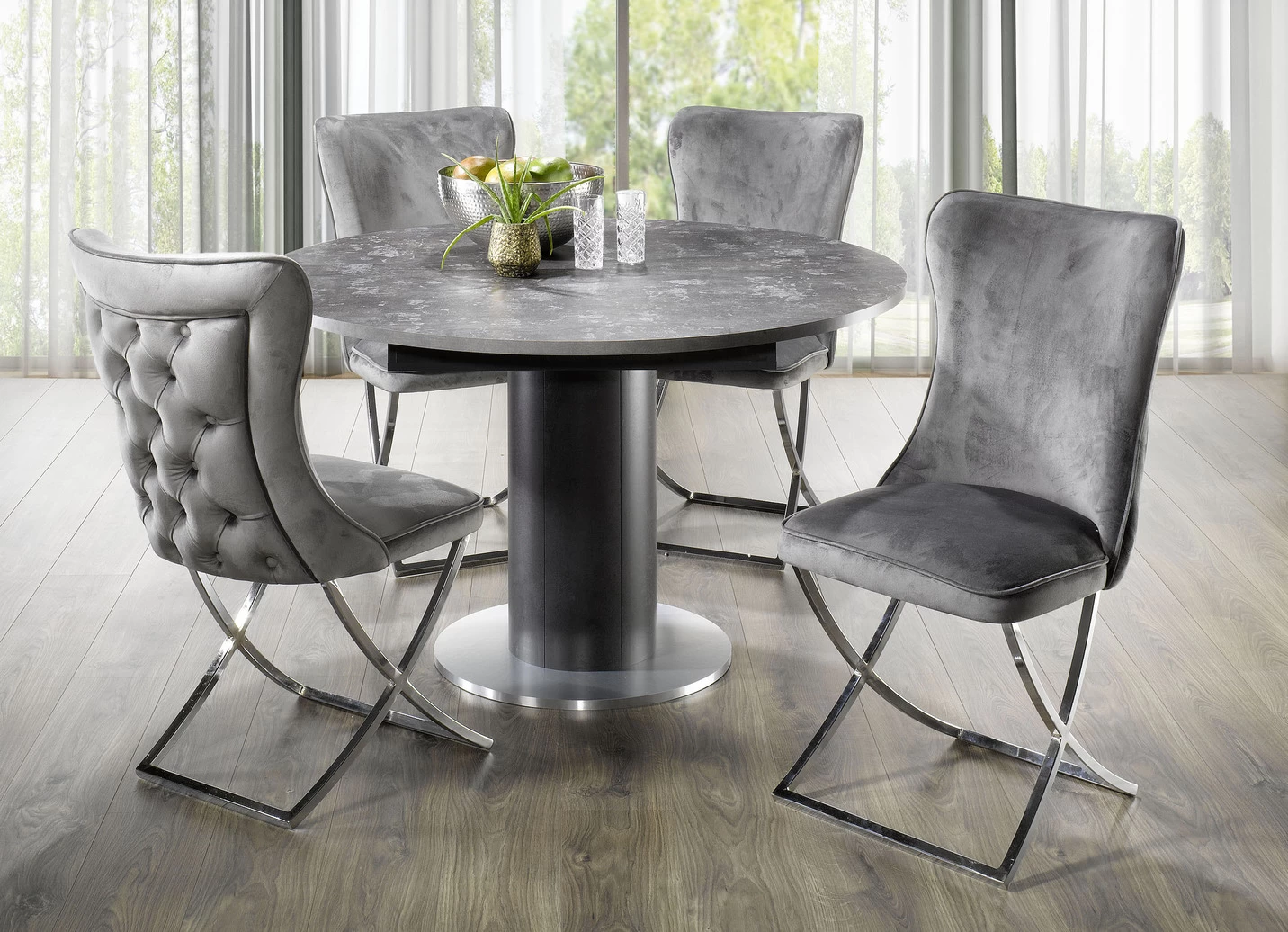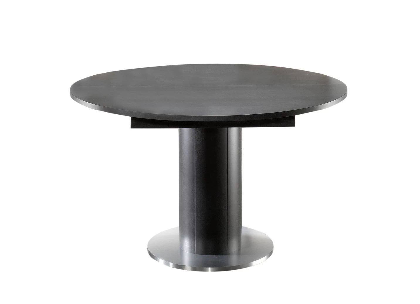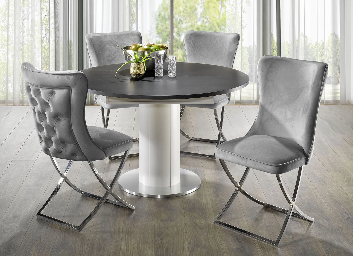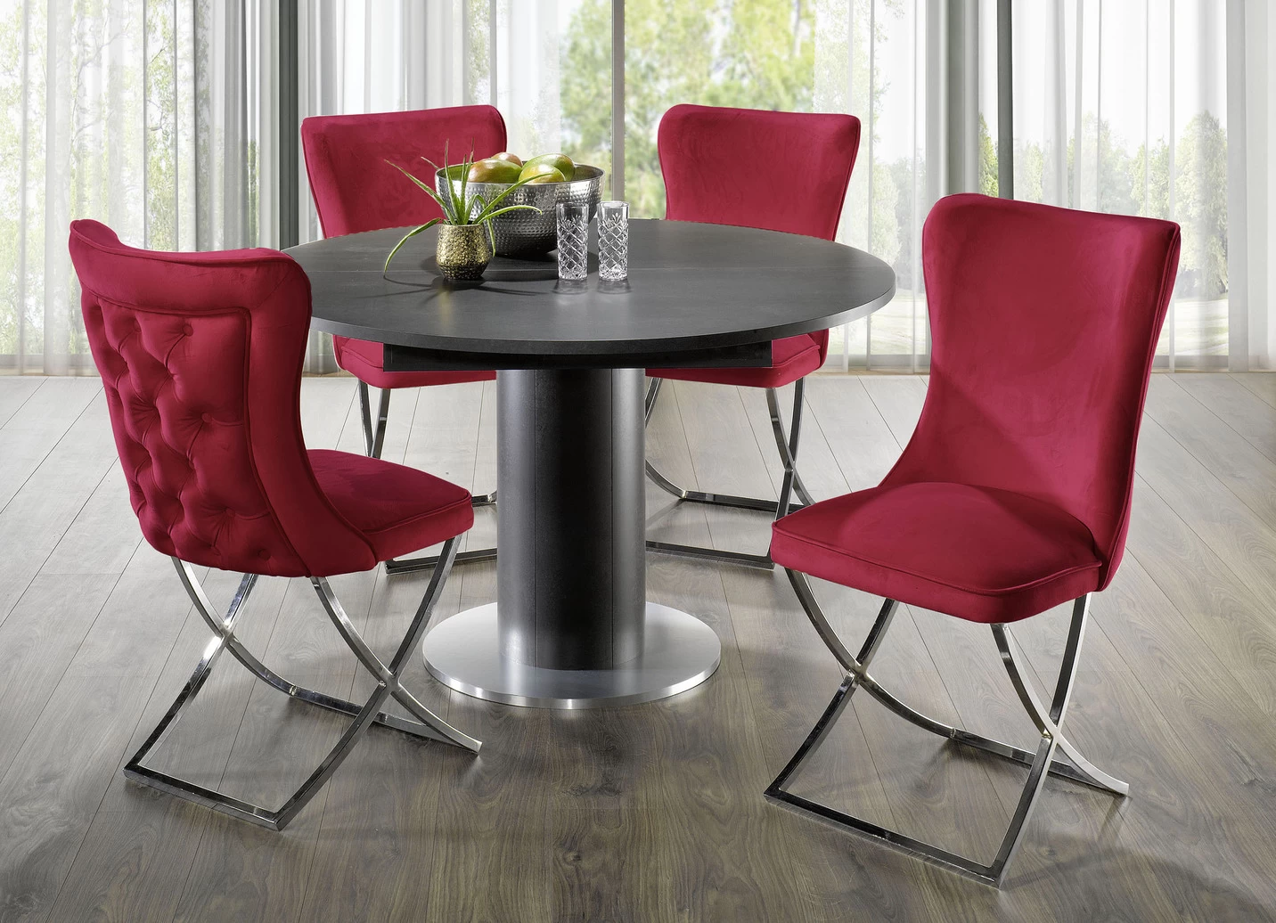 Schaffen Sie sich einen ganz individuellen Essplatz mit diesen außergewöhnlichen Esszimmermöbeln! Der runde Tisch ist durch eine Klappeinlage im Handumdrehen um 40 cm erweiterbar. Die Tischplatte ist jeweils farblich vom Gestell abgesetzt.