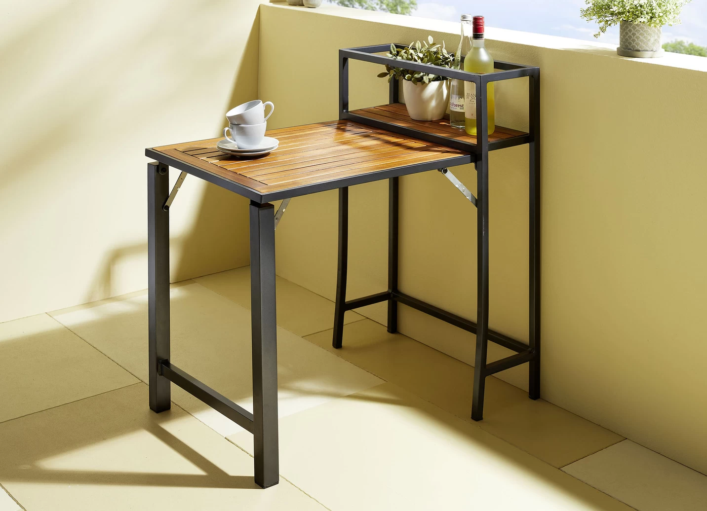 Balkon-Klapptisch: Maße: B60xH87xT93 cm; Tischplatte: B54,5xH75xT73 cm, klappbar, mit Ablagefläche