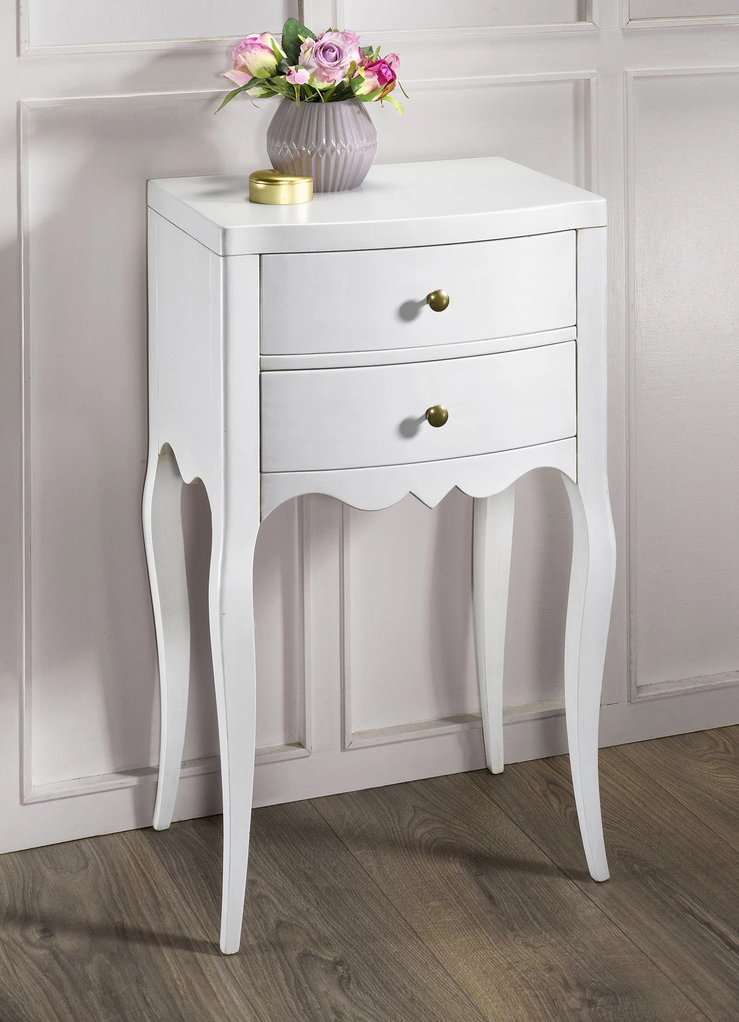 Eine schmuckvolle Ergänzung in jedem Raum ist dieser schöne Beistelltisch aus massivem Pappelholz. Mit goldfarbenen Metallknöpfen an den beiden Schubladen. Auf hübsch geschwungenen Beinen. Maße: B42xH71xT32 cm. Die Lieferung erfolgt aufgebaut.