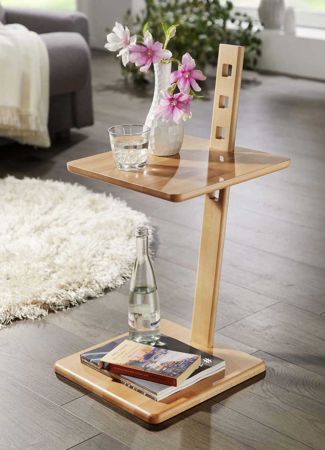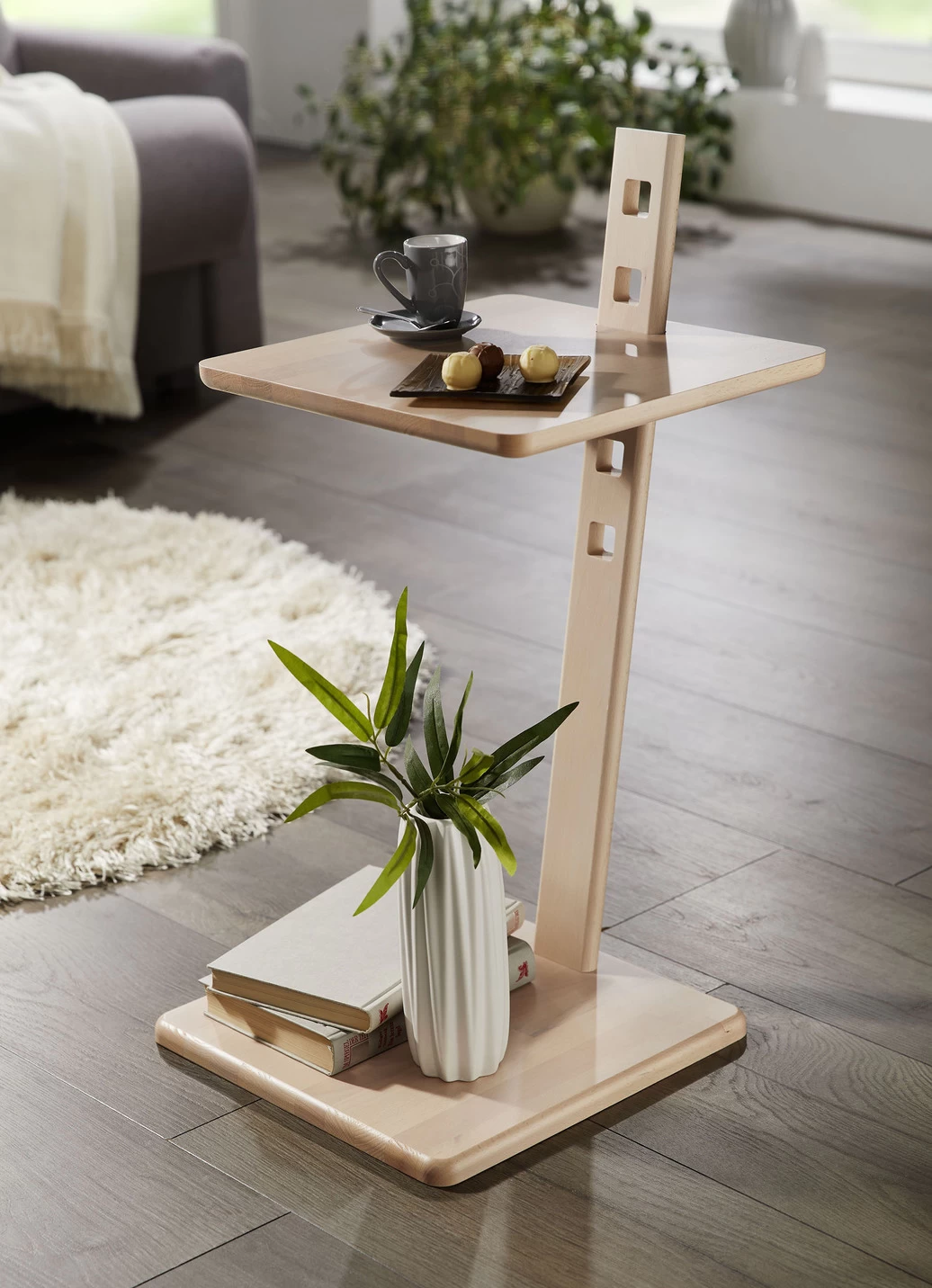 Ein individuelles Gestaltungselement ist dieser raffinierte Beistelltisch. Mit höhenverstellbarer Tischplatte (von 38–66 cm). Standfuß aus massivem Buchenholz.