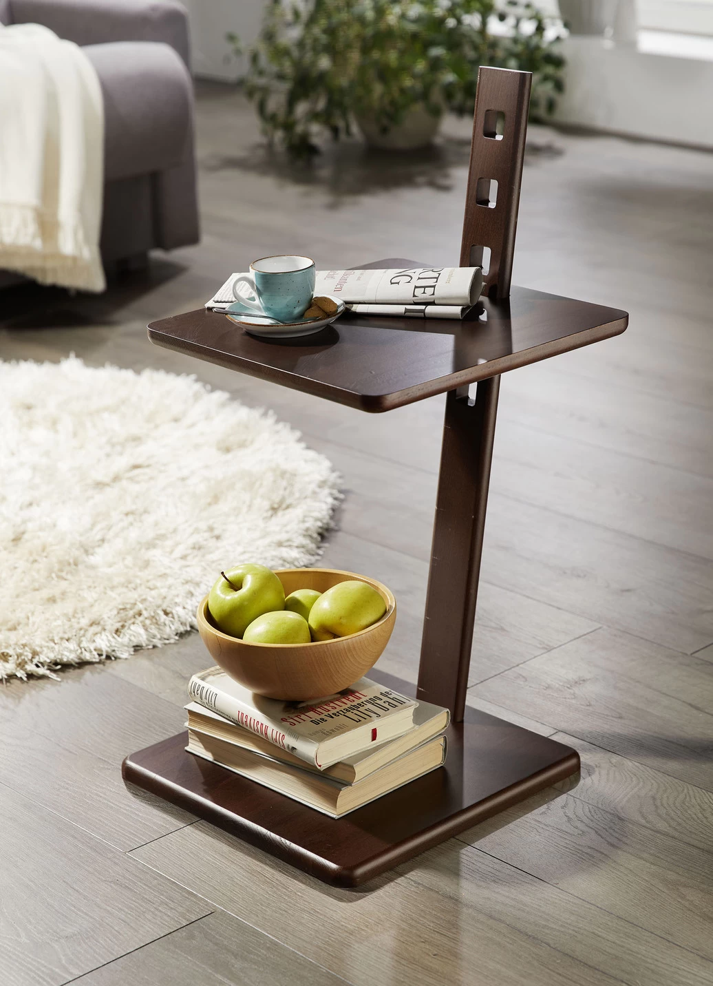 Beistelltisch mit höhenverstellbarer Tischplatte in Walnuss.
