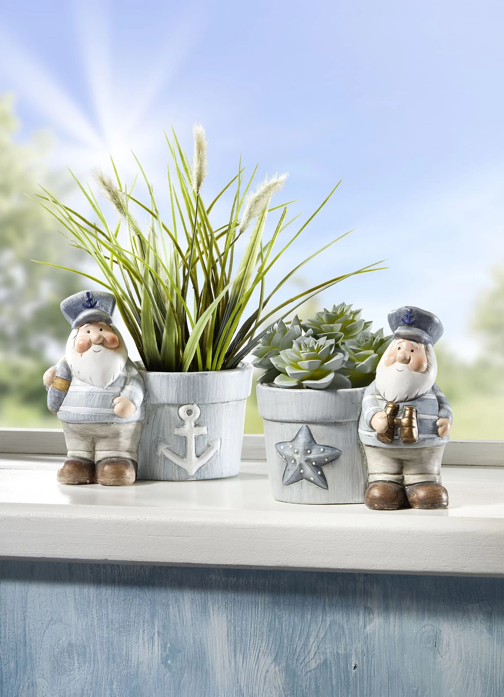 Mit diesen süßen Blumentöpfen im 2er-Set holen Sie sich maritimes Flair in Ihr Zuhause! Zwei lächelnde Seemänner mit Kapitänsmütze und Fernglas bzw. Rettungsring stehen neben den Töpfen, auf denen ein Seestern und ein Anker zu sehen sind. Liebevoll aus Keramik gefertigt und bemalt. Lieferung ohne Pflanzdeko.
