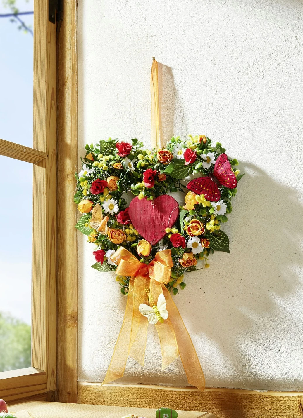Dieses bezaubernde Buchsbaumherz mit Holz-Herz in der Mitte ist mit orangefarbenen und roten Röschen sowie Schmetterlingen verziert. Mit passendem Textilschleifenband. Aus Kunst- und Textilmaterial gefertigt.