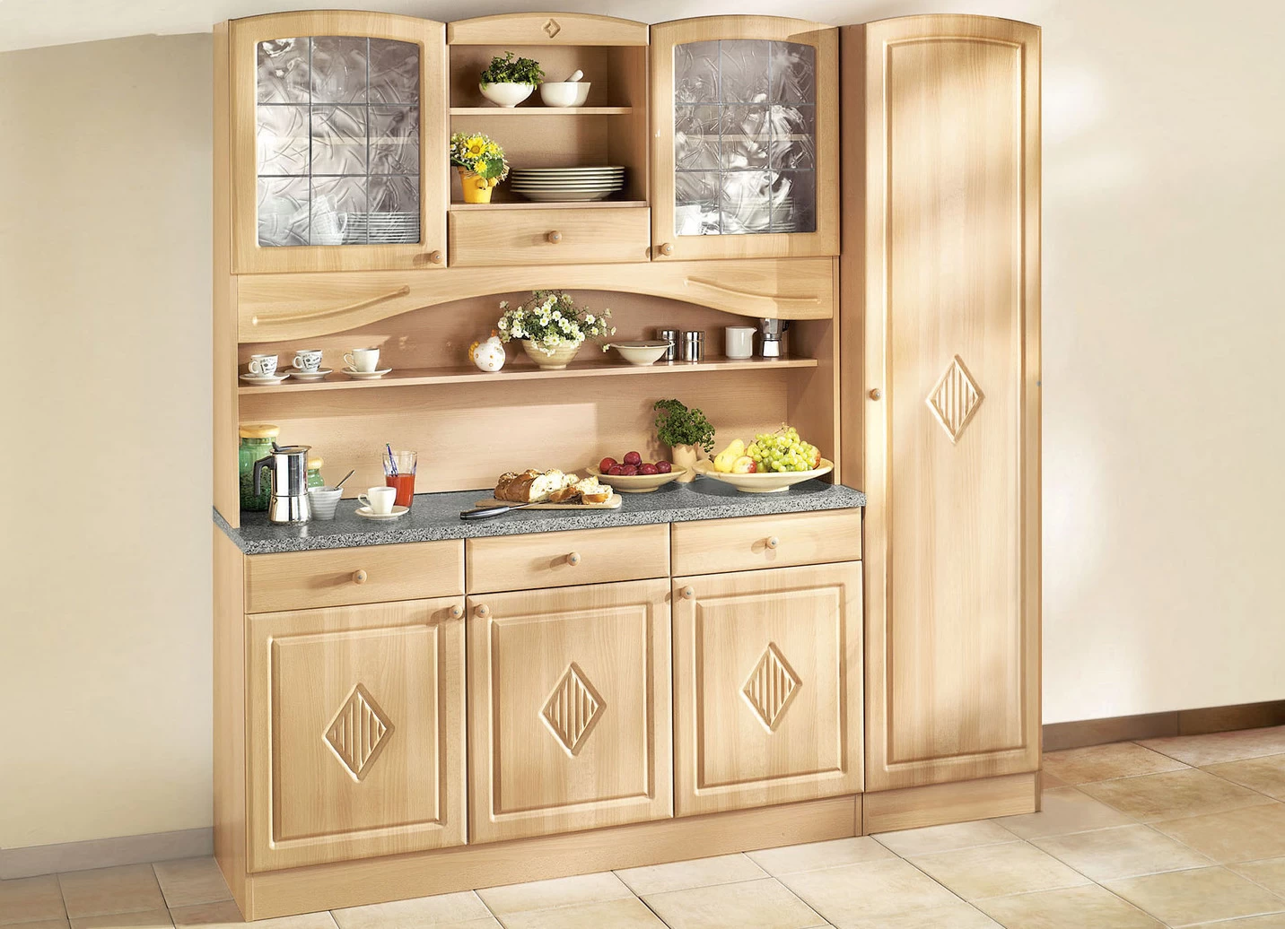 Pflegeleichtes Küchenprogramm mit profilierter Front aus MDF. Die Arbeitsplatte ist in Granit-Dekor. Schubladen auf Metallführungsschienen. Türen rechts oder links anschlagbar. Mit Aufbau-Anleitung, Hängeschränke mit Material zur Wandbefestigung