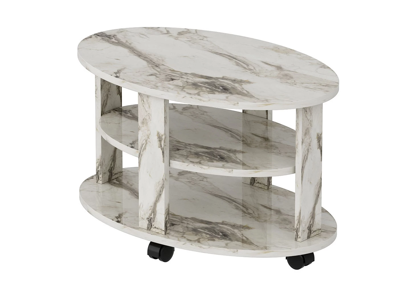 Eleganter, ovaler Couchtisch auf 4 praktischen Rollen. Mit robuster, melaminharzbeschichteter Tischplatte. Diese ist kratzfest, leicht zu reinigen und besonders geschützt gegen verblassen. Mit 2 geräumigen Ablagen unter der Tischplatte. Maße: B72xH42xT45 cm. Mit Aufbau-Anleitung zur einfachen Selbstmontage