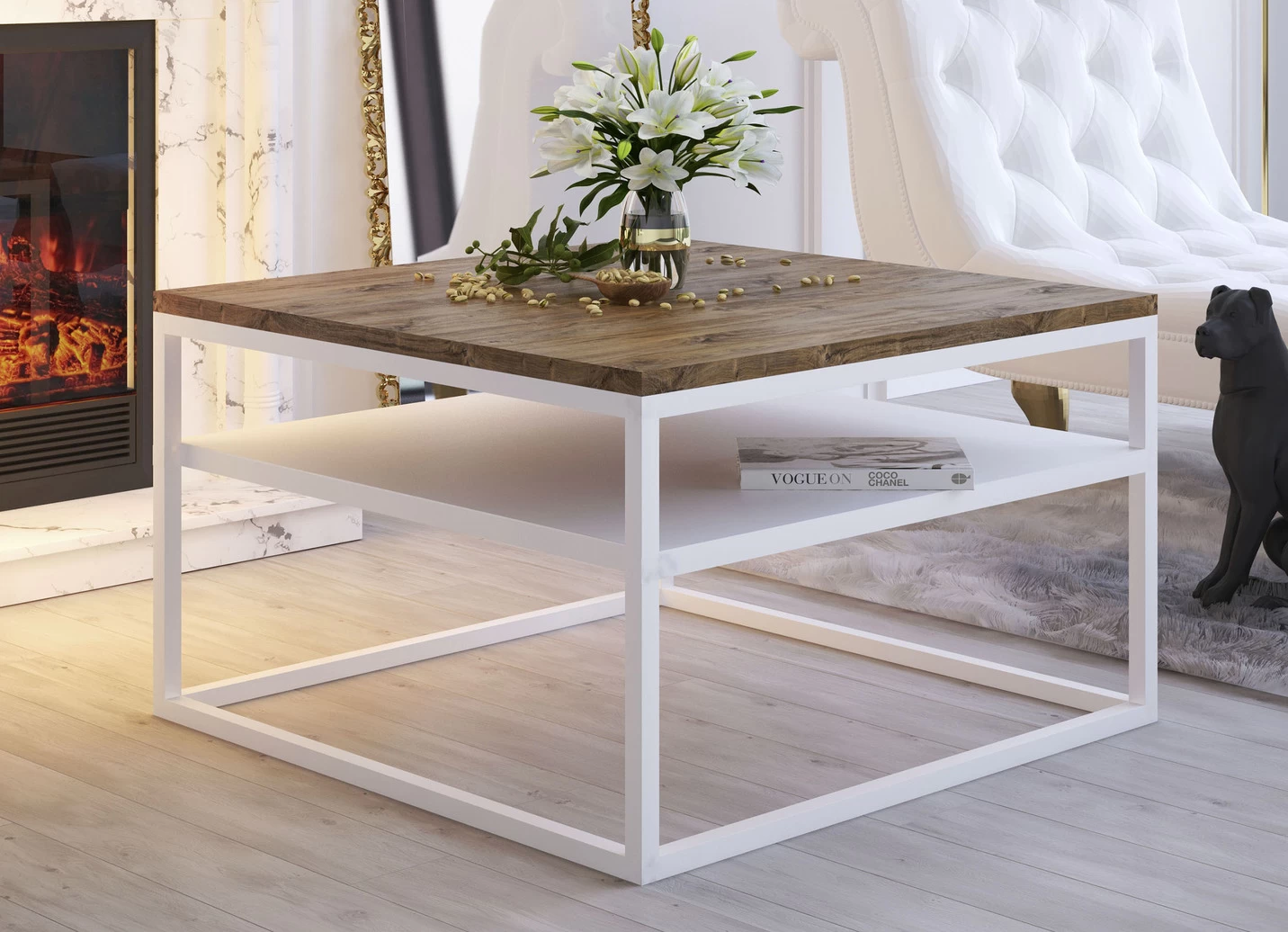Moderner Couchtisch mit farblich abgesetzter, quadratischer Tischplatte. Gestell und Ablage unter der Tischplatte aus pulverbeschichtetem Stahl. Maße: B70xH48xT70 cm. Mit Aufbau-Anleitung zur einfachen Selbstmontage