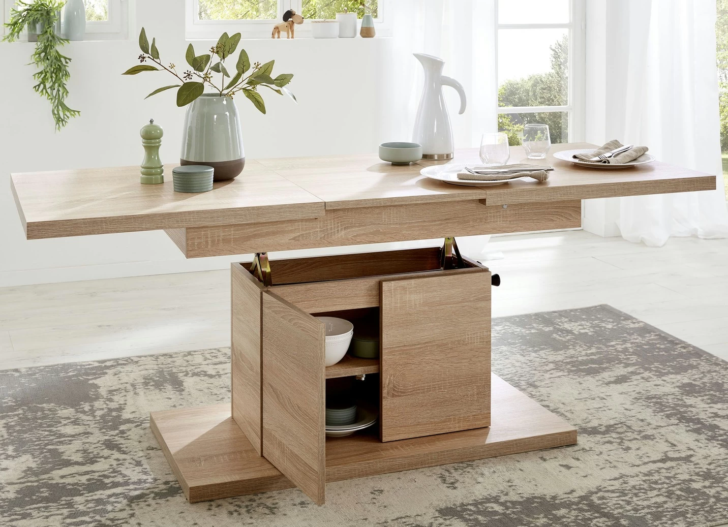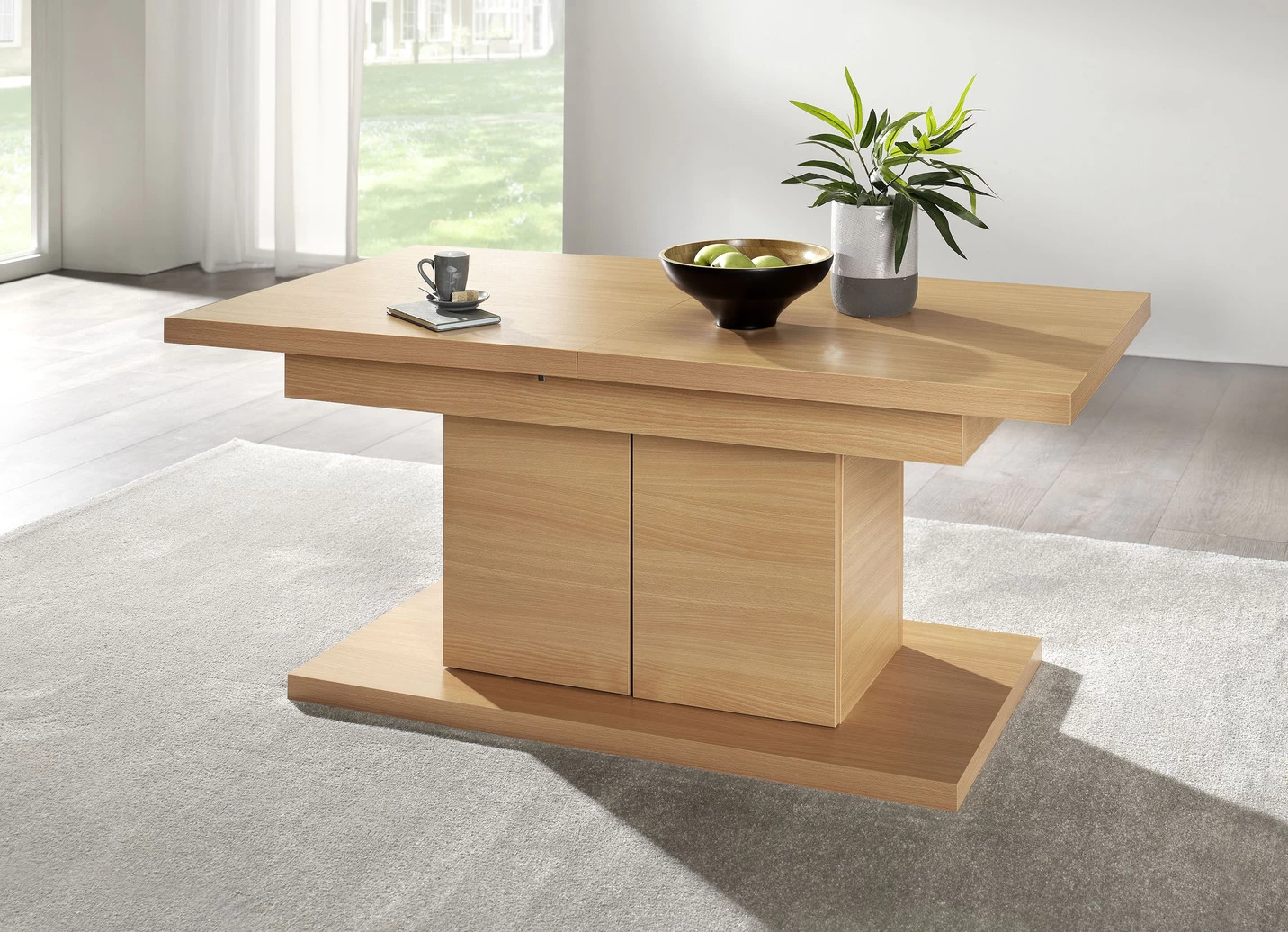 Moderner und super zu kombinierender Couchtisch. Der Tisch ist kratzfest, leicht zu reinigen und besonders geschützt gegen Verblassen. Mit praktischer Höhenverstellung, Auszieh-Mechanismus mit 40 cm breiter Einlage und Sockel mit 2 Türen mit Push-Up- System, dahinter 1 Einlegeboden.