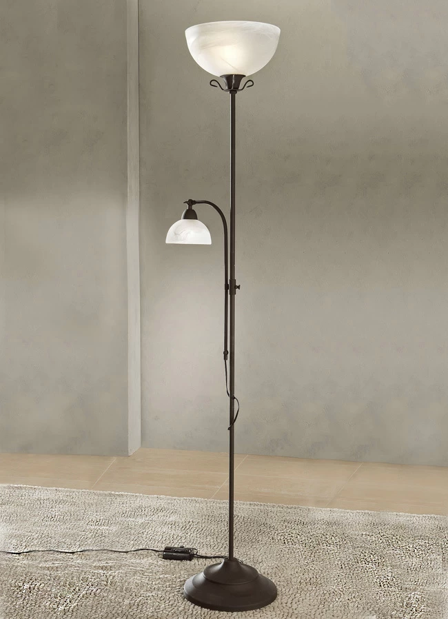 Exklusiver Deckenfluter mit geschwungenem Gestell aus antik rostfarbenem Metall sowie Schirm aus weißem Alabaster-Glas. Lieferung ohne Leuchtmittel. Mit Fußschalter. Mit Aufbau-Anleitung