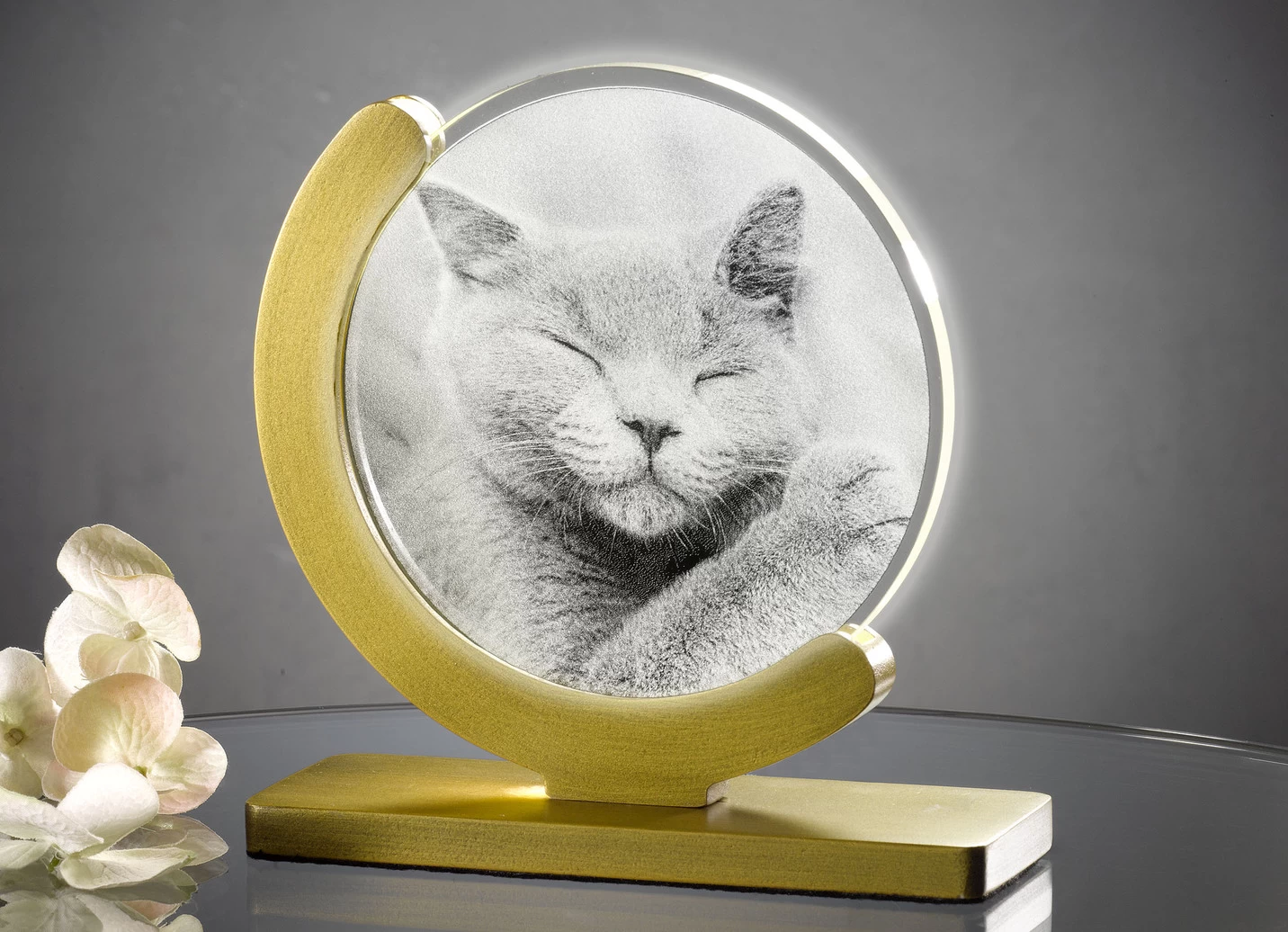 Außergewöhnliche LED-Tischleuchte mit einer Glasscheibe. Durch die dimmbare Beleuchtung wird das wunderschöne, gelaserte Motiv einer Katze optimal beleuchtet. Standfuß und Halterung aus lackiertem Holz. Die LED-Leuchtmittel sind fest verbaut und daher nicht austauschbar. 220 Volt, 3,2 Watt, 2700 Kelvin. Maße: B16xH16xL6 cm. Die Lieferung erfolgt aufgebaut.