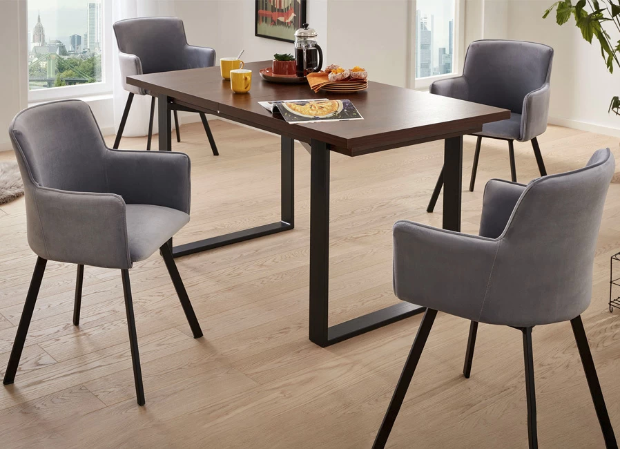 Eine absolut clevere Lösung für Ihren schönen Essbereich sind diese attraktiven Esszimmermöbel mit geschmiedeten Metallfüßen in tollen Farben! Durch die mitgelieferte Einlegeplatte (Breite 40 cm) bietet der teilmassive Tisch mit kratzfester Oberfläche viel Platz auch für eine größere Gesellschaft. Die stabilen Stühle sind elegant, mit leicht glänzendem, sehr angenehmem Samtbezug (100% Polyester) bezogen. Tisch mit Aufbau-Anleitung, die Stühle werden aufgebaut geliefert.