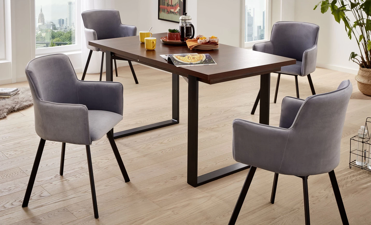 Vorteilhaftes Komplettangebot: 5-teilige Essgruppe, bestehend aus 1 Esstisch, Maße: B150–190xH78xT80 cm und 4 Stühlen, Maße: je B56xH84,5xT57 cm; Sitzbreite 43,5 cm, Sitzhöhe 44 cm, Sitztiefe 43,5 cm.