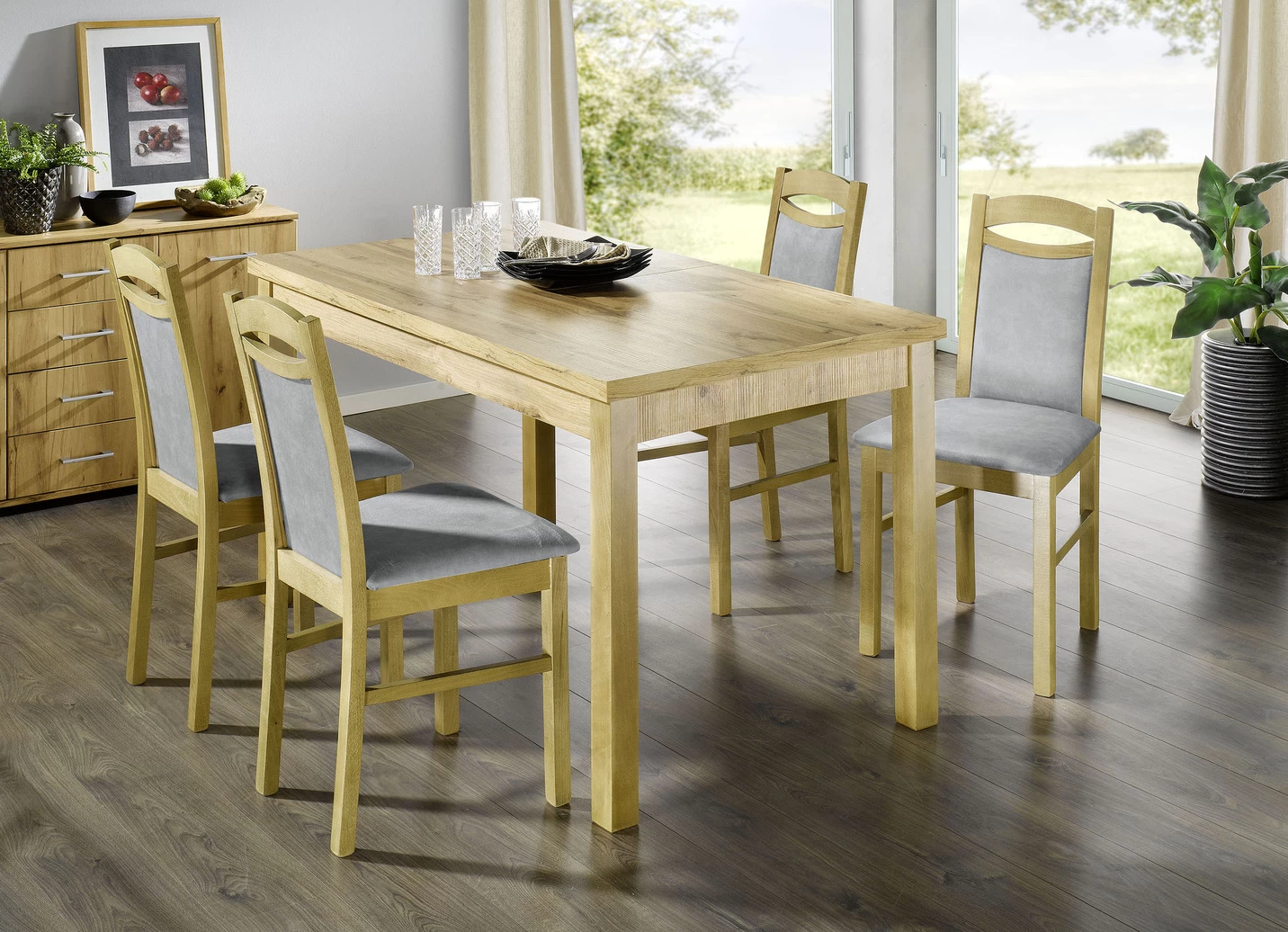 Diese hochwertigen Esszimmermöbel werden Sie begeistern! Die Stühle aus massivem Buchenholz sind mit Schaumstoff gepolstert und mit einem angenehmen Stoffbezug (100% Polyester) bezogen. Die Stühle werden aufgebaut geliefert.