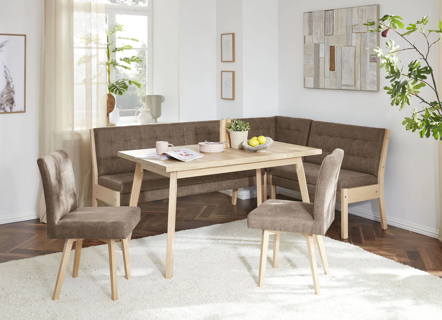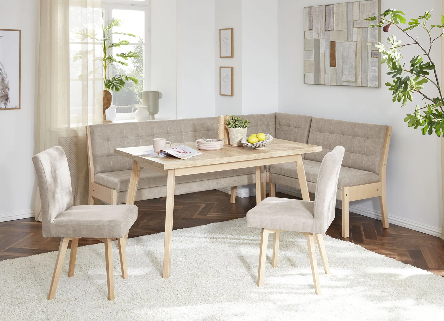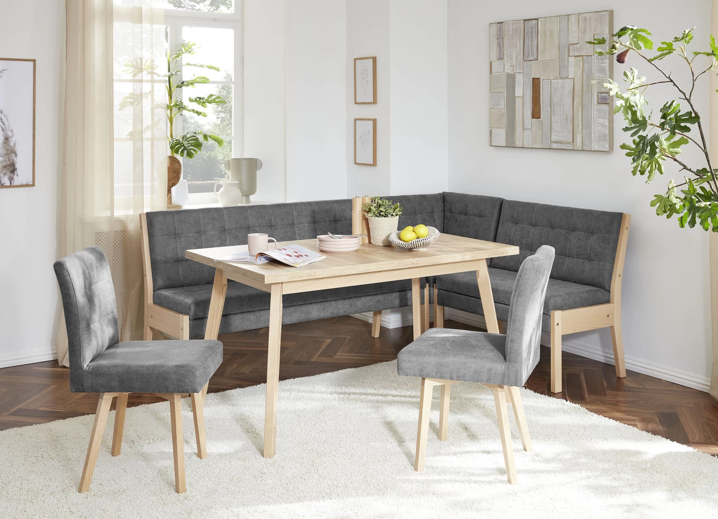 Die Eckbank ist links oder rechts montierbar, der stabile Tisch besitzt eine Tischplatte in natürlicher Holzmaserungs-Optik aus pflegeleichtem Melamin. Die Sitz- und Rückenflächen der Stühle sind wie die Eckbank mit Schaumstoffpolsterung gefertigt und mit einem Bezug in Wildleder-Optik (100% Polyester) überzogen. Mit Aufbau-Anleitung zur Selbstmontage, die Stühle werden aufgebaut geliefert