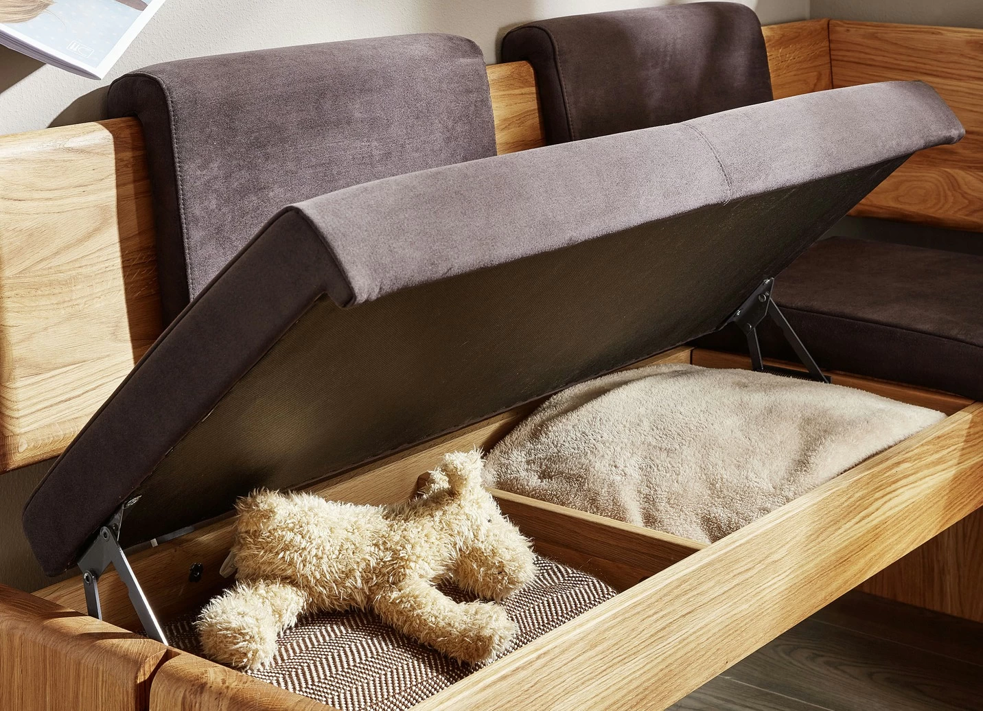 - Truhen-Eckbank wahlweise in 2 Stellvarianten (192×167 cm oder 167×192 cm), Höhe 91 cm mit Rückenkissen (4 Stück), Sitzhöhe 51 cm, Sitztiefe 43 cm