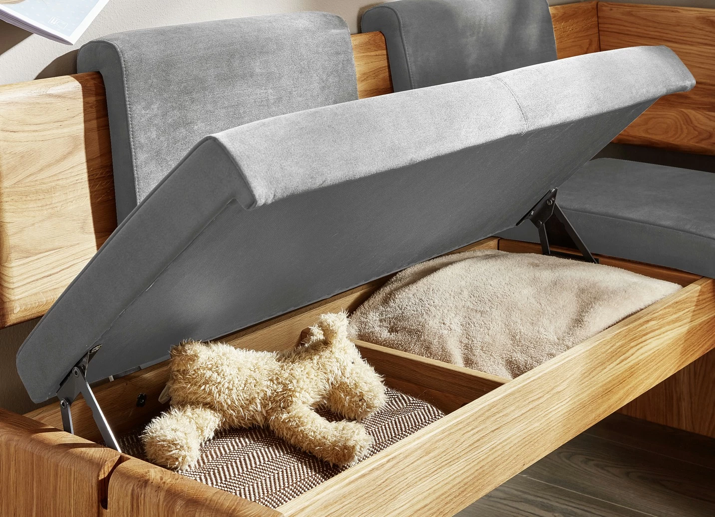 Esszimmermöbel in Kernbuche, geölt oder Eiche natur, geölt. Die Sitzflächen sind gepolstert, an den Rückenlehnen lassen sich die Rückenkissen (je B50,5xH34xT9 cm) nach links oder rechts verschieben. Bezugstoff in Nubuk-Optik (100% Polyester). Die Bänke bieten unter den Sitzflächen viel Stauraum. Mit Aufbau-Anleitung; Stühle werden aufgebaut geliefert.