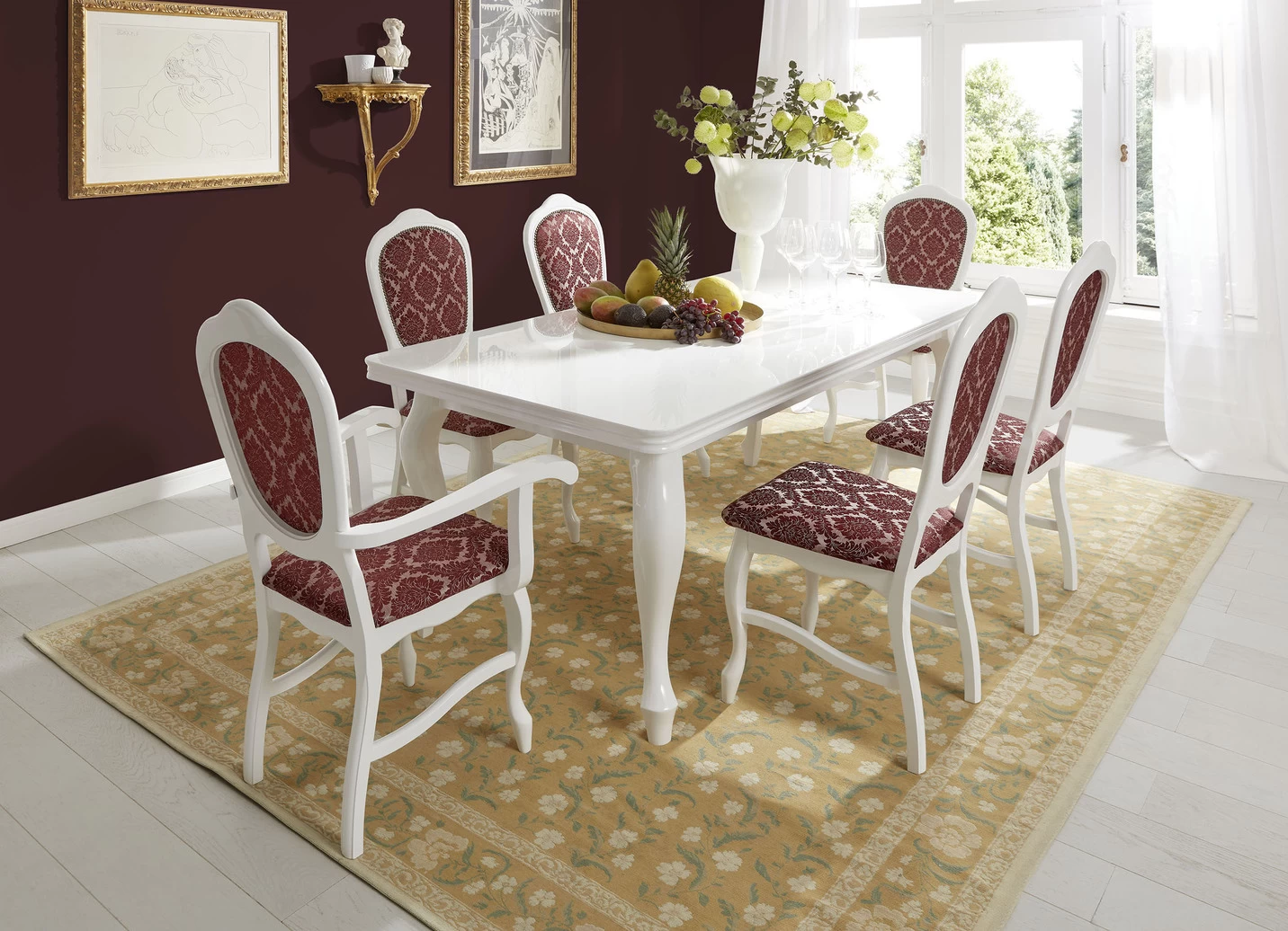 Elegante Esszimmermöbel mit hochglanzlackierter Oberfläche in Weiß. Die klassischen, weich gepolsterten Stühle aus massivem Buchenholz sind mit hochwertigem Schaumstoff, aufwendigen Schnitzereien am Holzgestell und schmuckhaftem Nagelzierband an der Rückenlehne gefertigt. Edel dessinierter Bezug