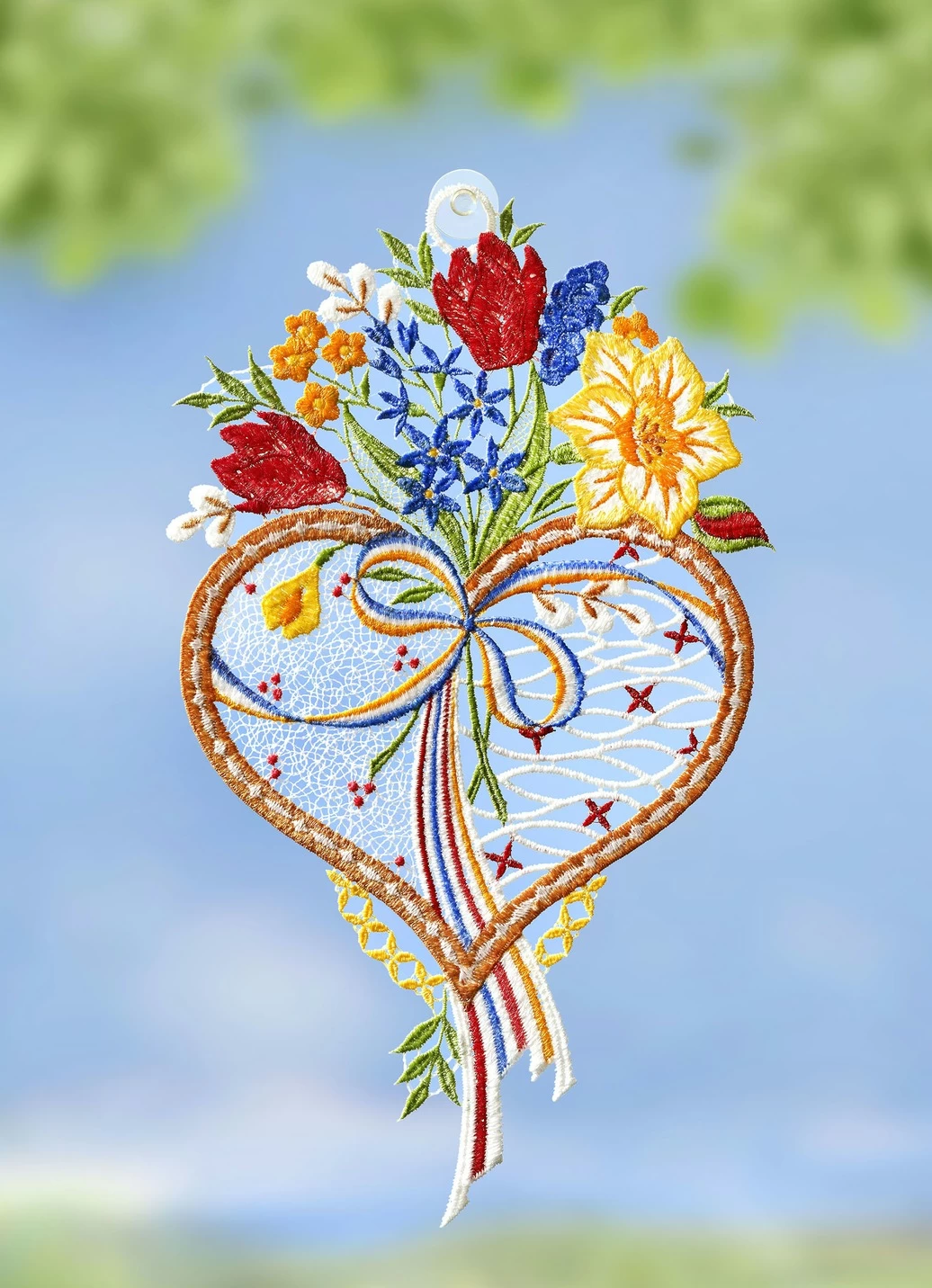 Fensterbild Herz aus echter Plauener Spitze in Bunt.