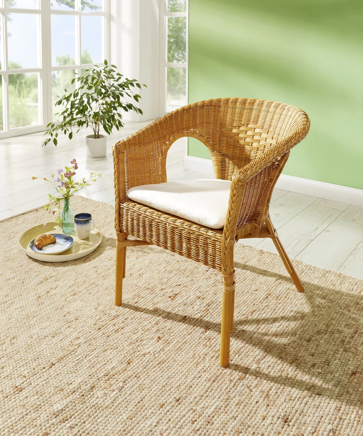 Formschöner Rattansessel aus Peddigrohrgeflecht in Honig.