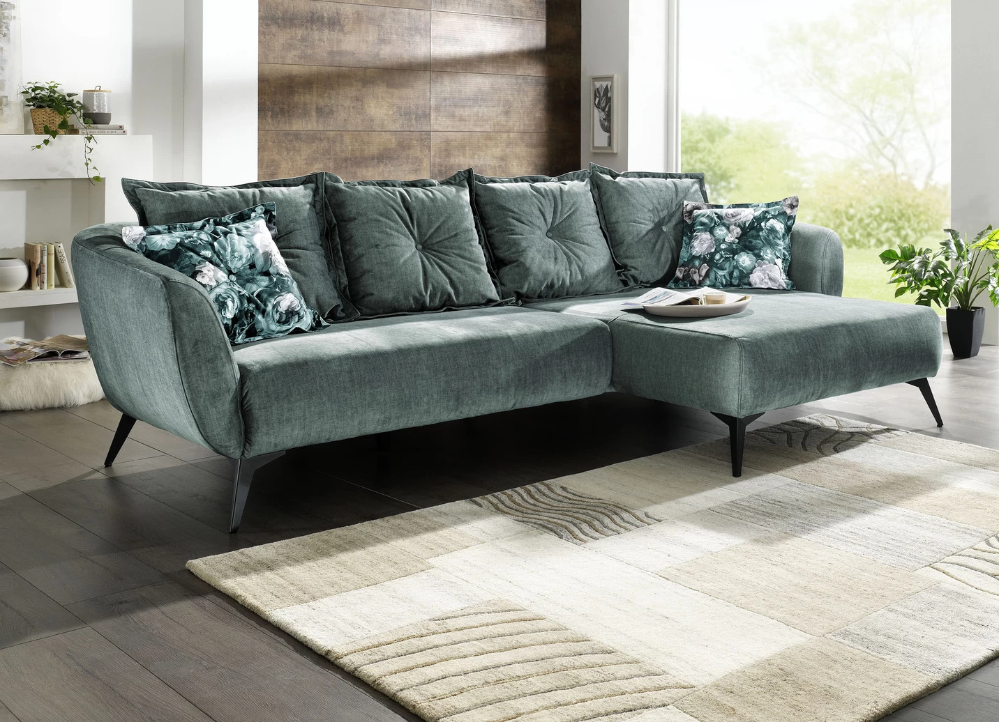 Frei im Raum aufstellbare Polsterecke mit Dekokissen in den Maßen 277×162 cm und in Grün.