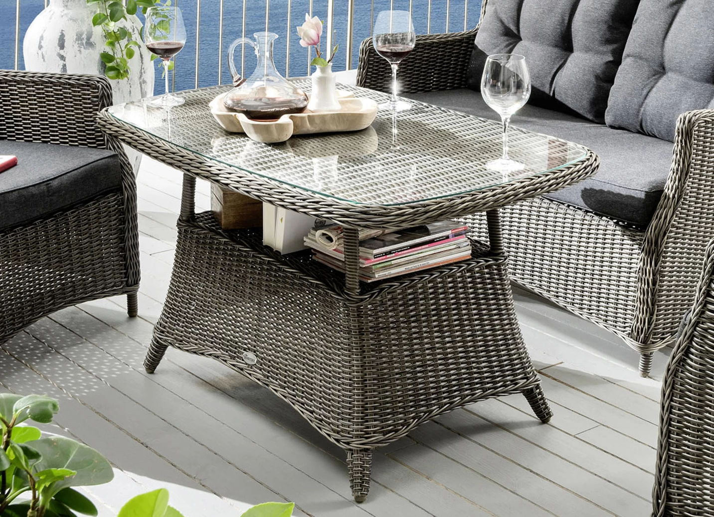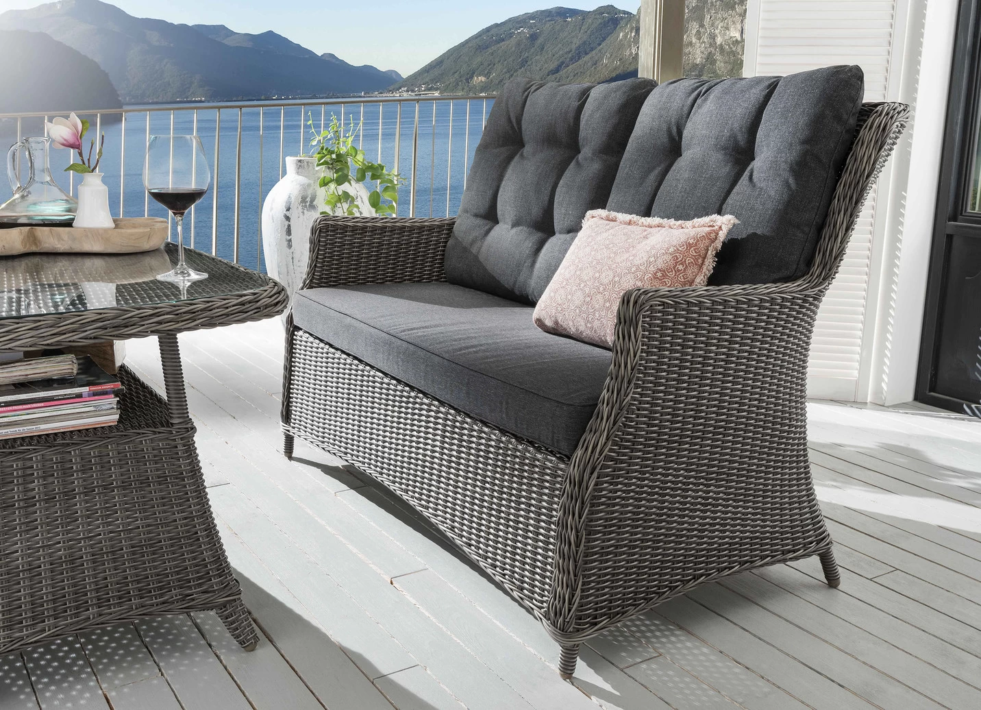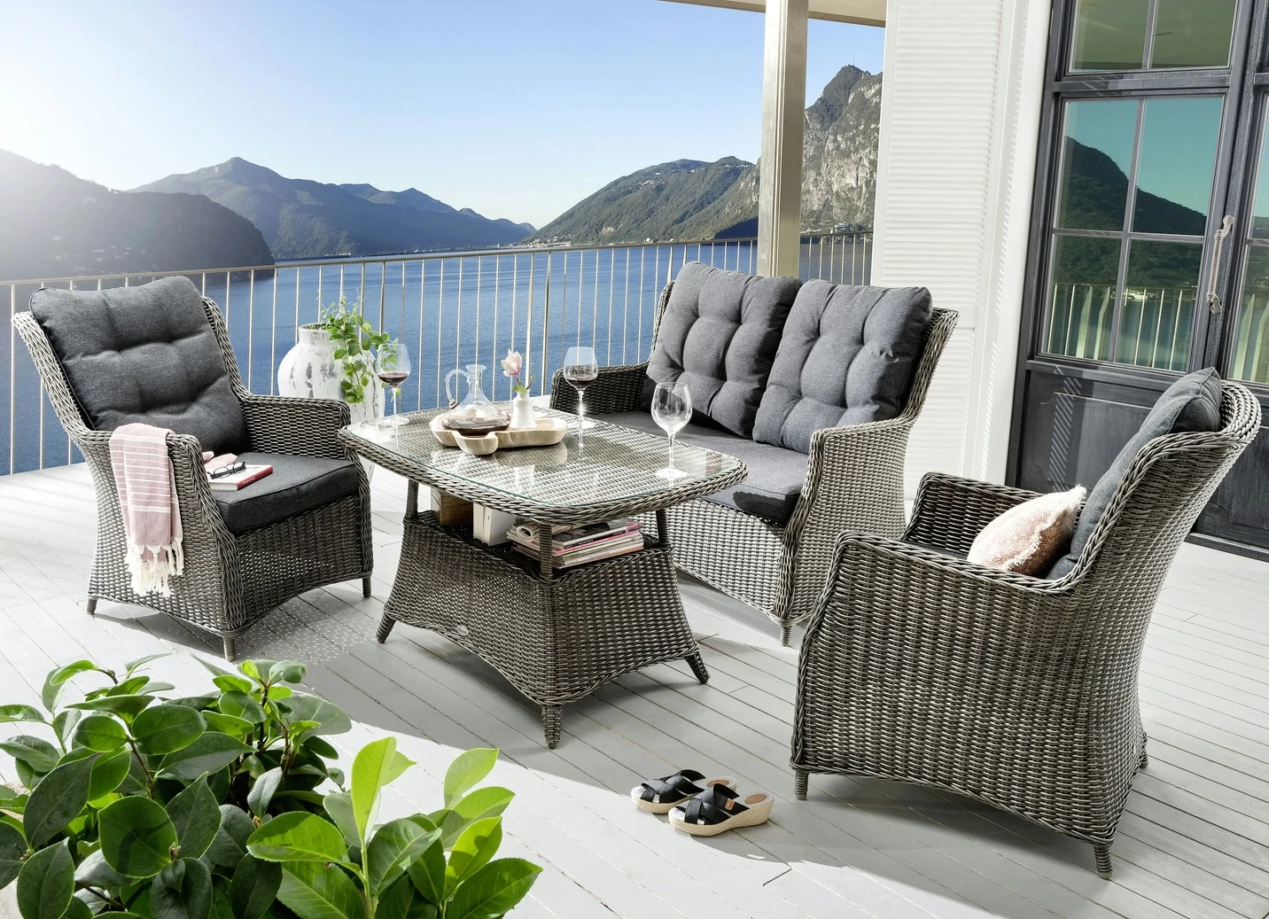 Mit diesen großzügigen Gartenmöbeln in Komforthöhe werden Garten und Terrasse zum Mittelpunkt der Geschehnisse! Die stabilen, rostfreien Aluminiumgestelle sind von Hand mit witterungs- und UV-beständigem Polyrattan umflochten (attraktives Rund- und Halbrundgeflecht).