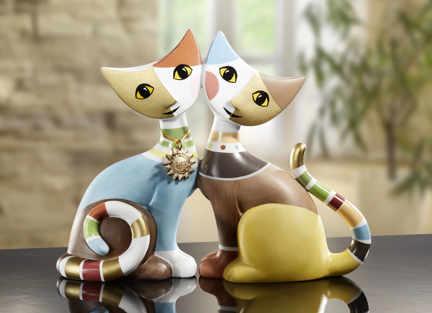 Das Traditionsunternehmen Goebel präsentiert Ihnen diese bezaubernde Katzenfigur Letizia e Cosmo der Künstlerin Rosina Wachtmeister als Jahreskatze 2023 in limitierte Auflage von 10.000 Stück mit Zertifikat. Hergestellt aus Porzellan und liebevoll von Hand bemalt. Geschmückt mit funkelnden Kristallsteinen sowie goldfarbenem Anhänger in Sonnenform mit der Jahreszahl 2023. Maße: B22xH17xT6,5 cm.