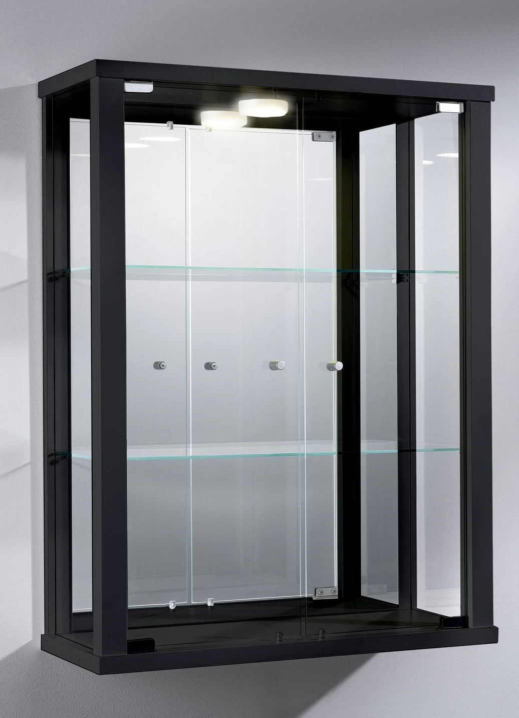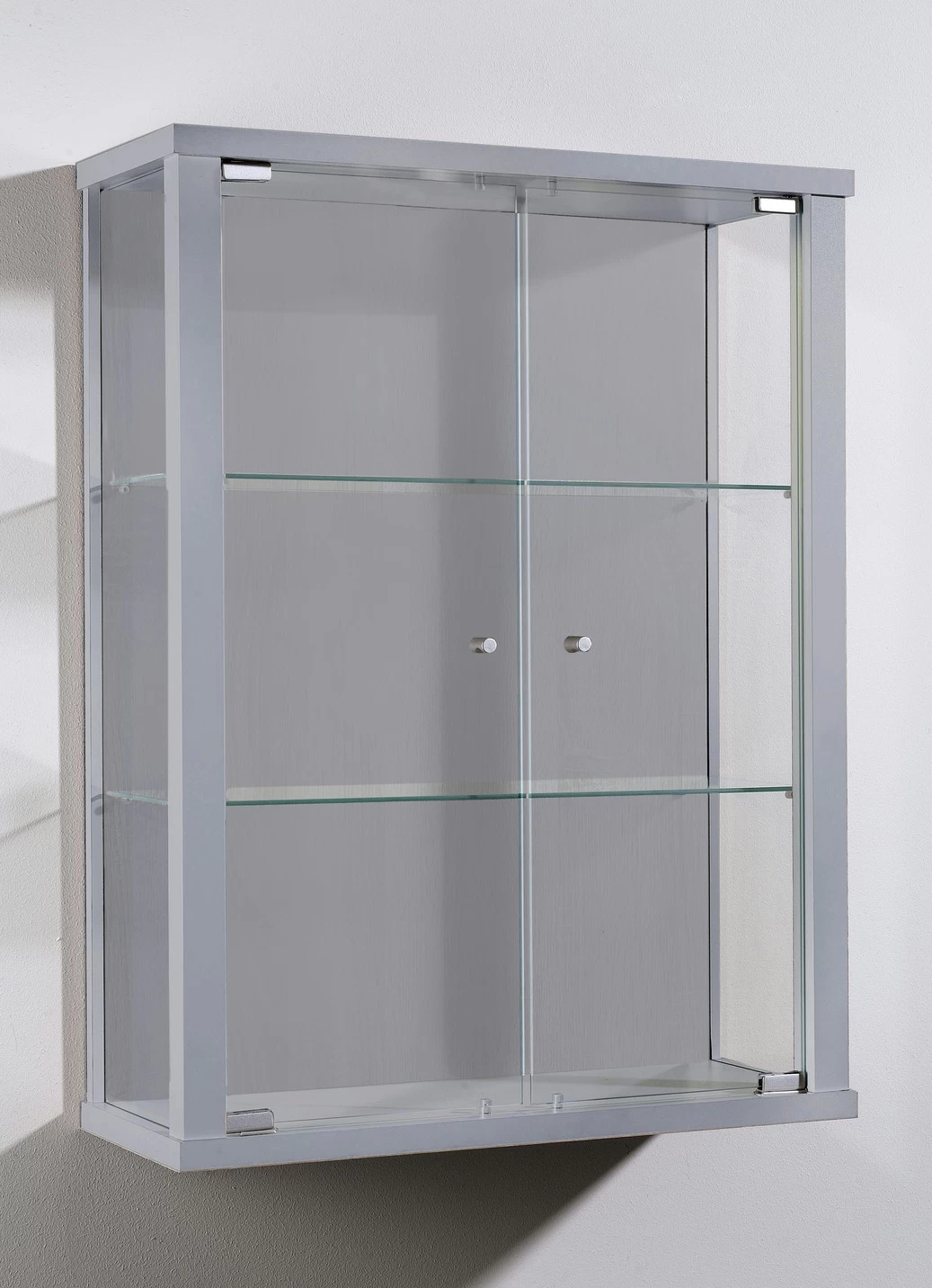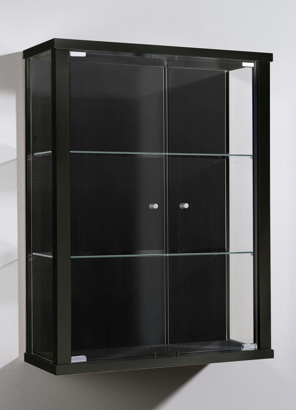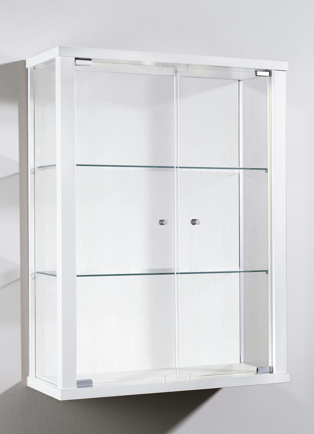 Geschmackvolle und moderne Hängevitrine mit ansprechenden Dekors und robuster Verarbeitung. 2 Glastüren, dahinter je 2 Glas-Einlegeböden. Mit rundem ESG-Sicherheitsglas.