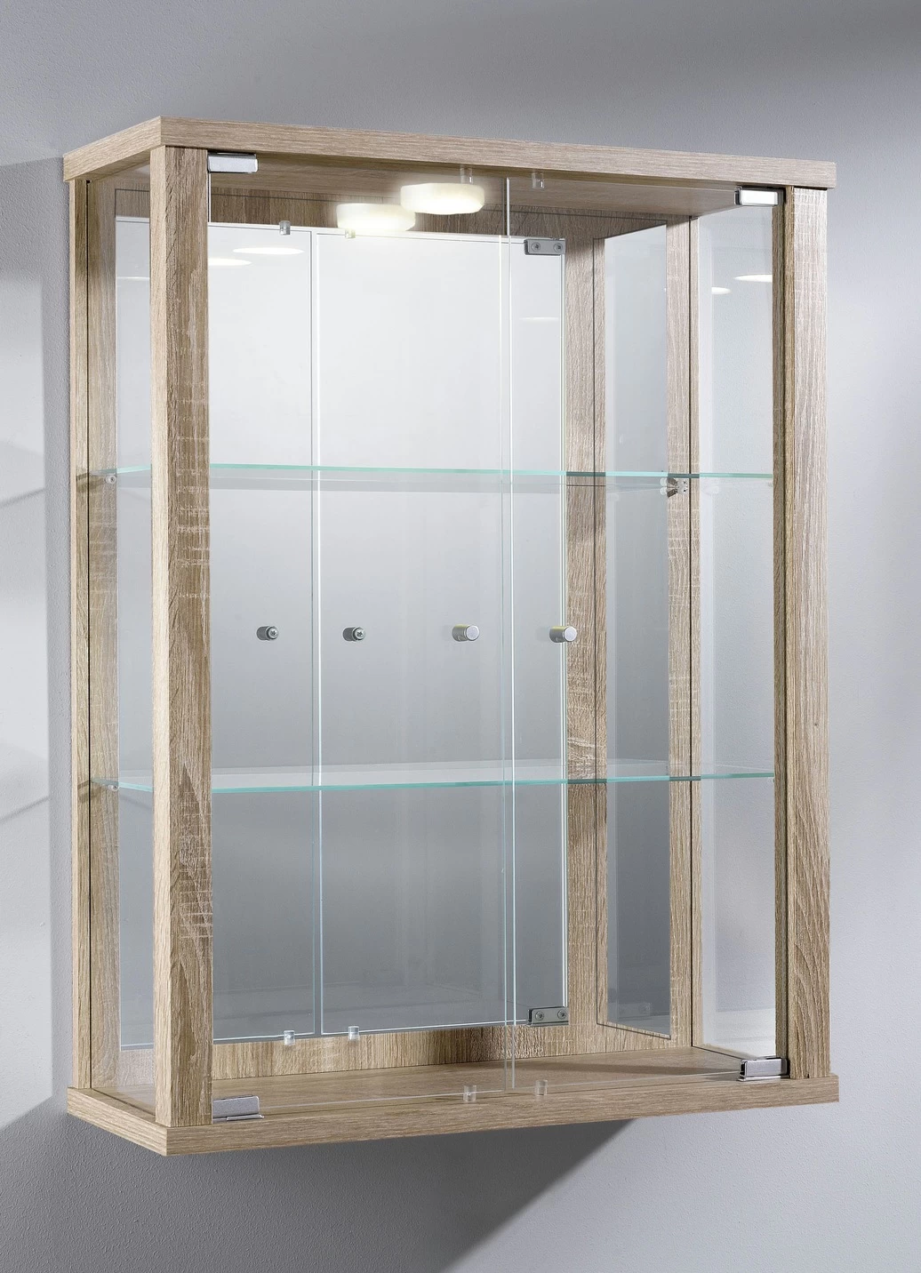 Hängevitrine mit ESG-Sicherheitsglas in der Ausführung ohne LED-Beleuchtung und in Eiche-Sonoma.