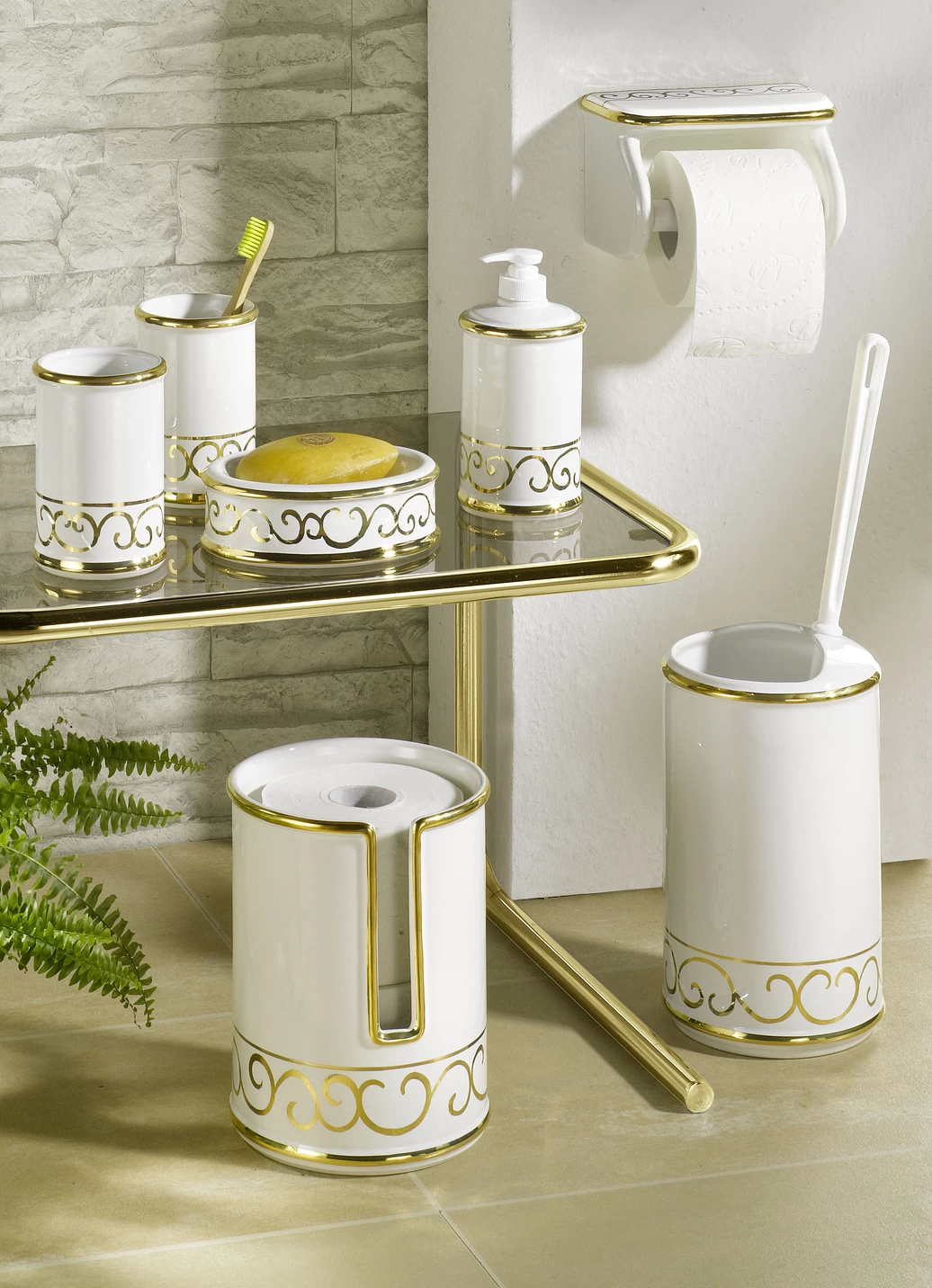 Wunderschöne, im klassischen Stil zeitlos edle Badezimmeraccessoires in Creme-Gold mit handaufgetragener Goldfarbe (10% Echtgoldanteil) auf der Ornamentzier und den Rändern. In italienischen Werkstätten aufwendig aus glasierter Keramik gefertigt.