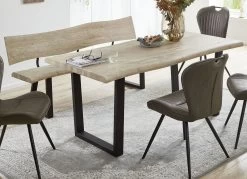Für rustikale Gemütlichkeit in Ihrem Essbereich stehen diese hochwertigen Esszimmermöbel! Faszinierende Bank mit Rückenlehne und toller Tisch aus Wildeiche Nachbildung mit gerundeter Baumkante an den Rändern. Auf stabilem, schwarzem Metallgestell. Bank belastbar bis 260 kg. Mit Aufbau-Anleitung zur einfachen Selbstmontage.