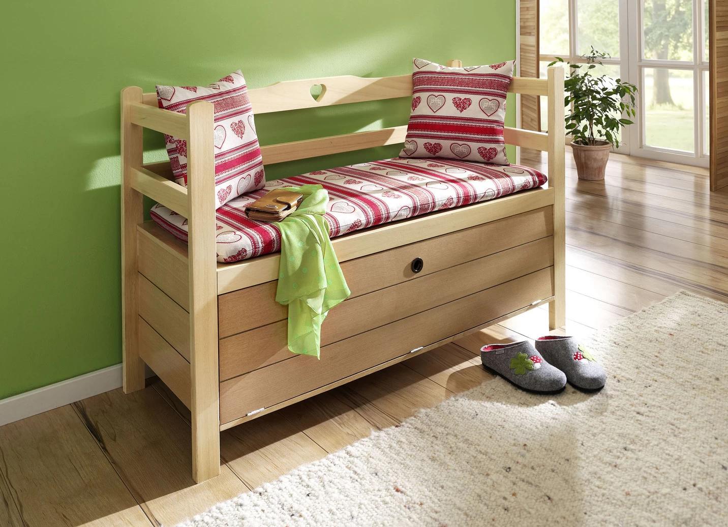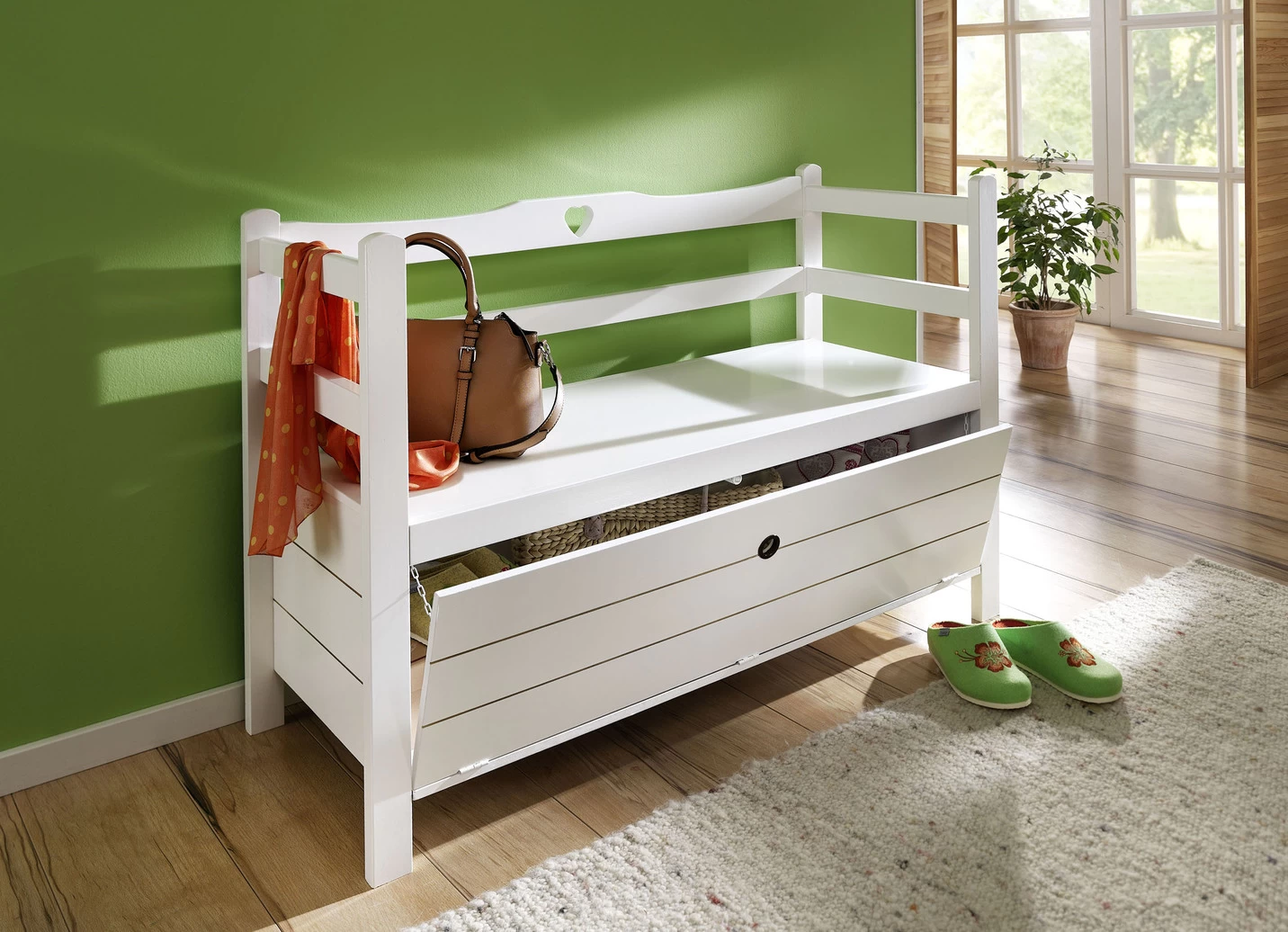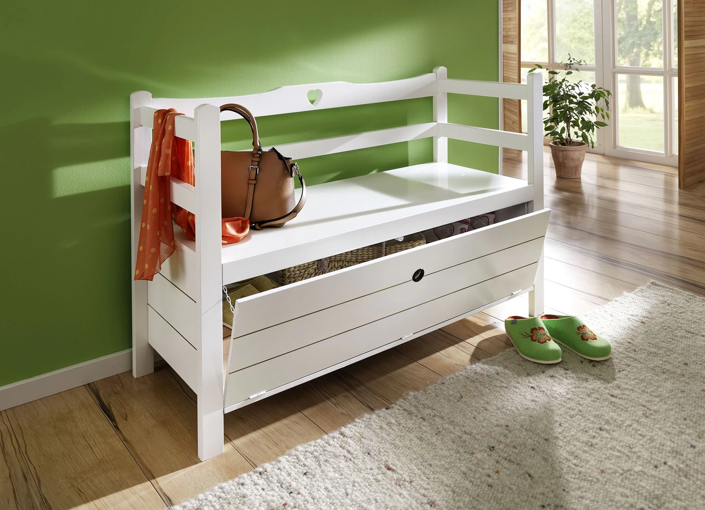Diese hochwertige Sitzbank begeistert mit ganz besonderem Charme! Aus teilmassivem Holz gefertigt, mit Herz in der aufwendig geschwungenen Rückenlehne. Das aufklappbare Fach mit Magnetverschluss bietet Ihnen nützlichen Stauraum.