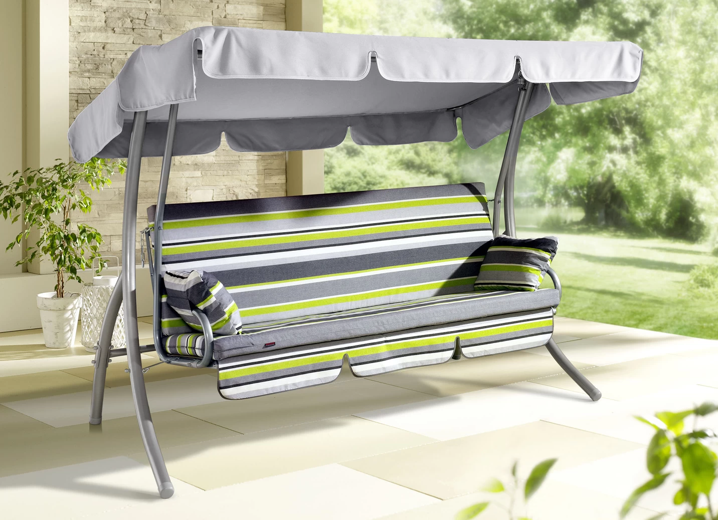 3-Sitzer-Schaukel. Stahlrohrgestell (vorverzinkt und pulverbeschichtet) mit klappbarer Lehne und Sonnendach aus 100% Polyacryl (waschbar). 8 cm starke Schaumstoffplatte mit Vliesummantelung. Die Auflage besteht aus 2 Wendekissen mit Reißverschluss, 2 Seitenkissen und Unterlage mit Volant. Bezug 100% Baumwolle.