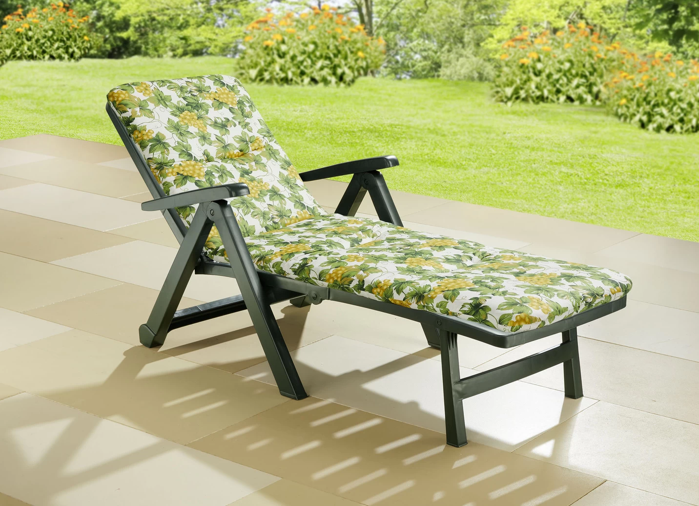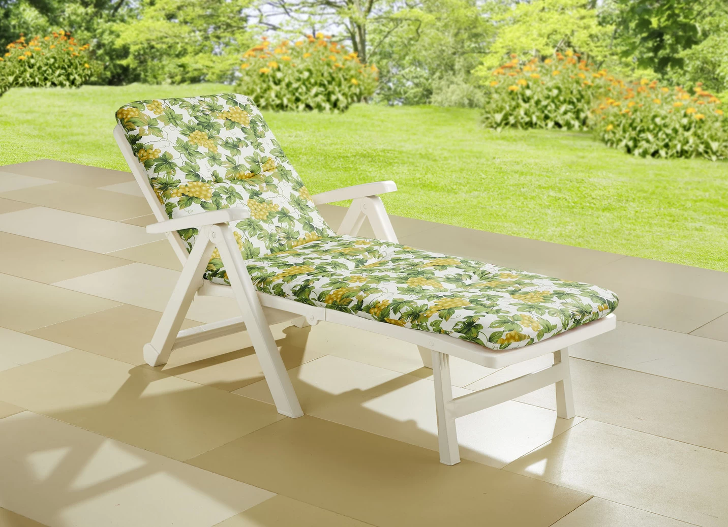 In Deutschland gefertigte, 6 cm starke Liegen-Auflage mit vliesummantelter Schaumstoffplatte. Bezug aus 75% Baumwolle und 25% Polyester.