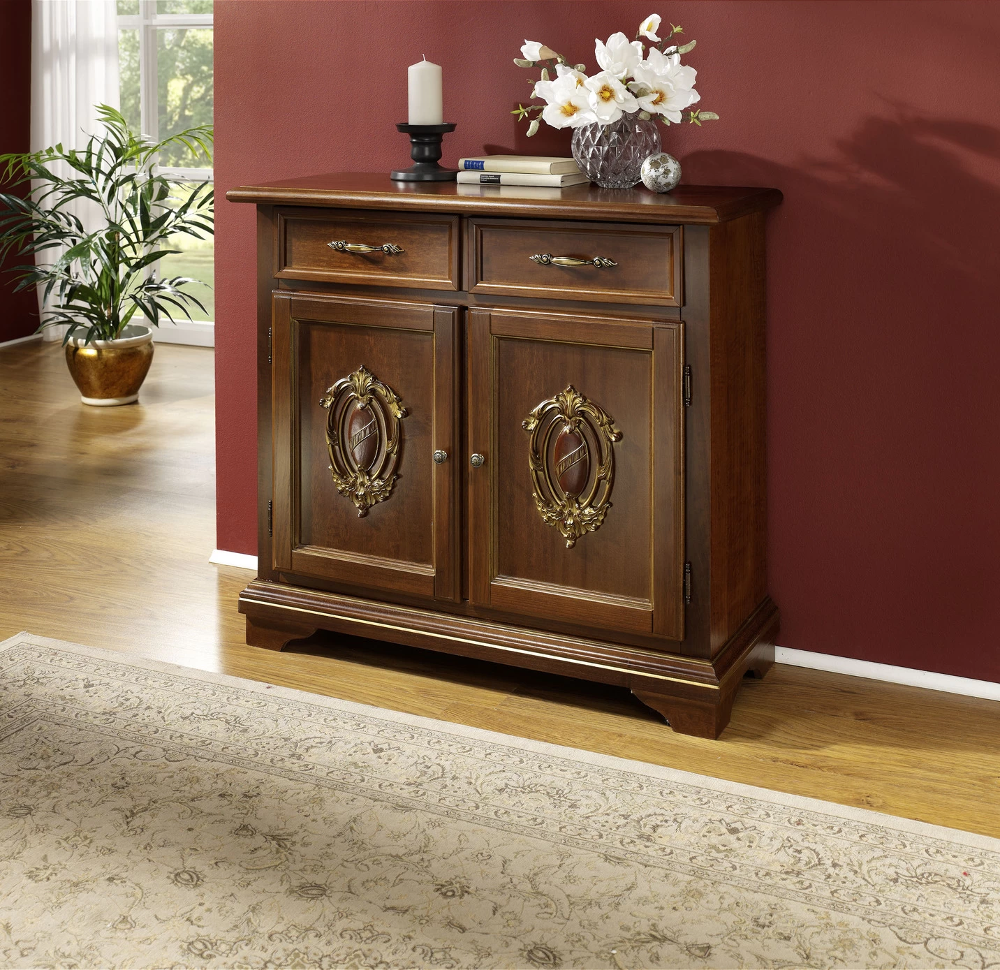 Detailreiche, teilmassive italienische Möbelserie. Mit hochwertiger Holz-Applikation an den Türen sowie hübschen goldfarbenen Metallgriffen. Die Lieferung erfolgt aufgebaut