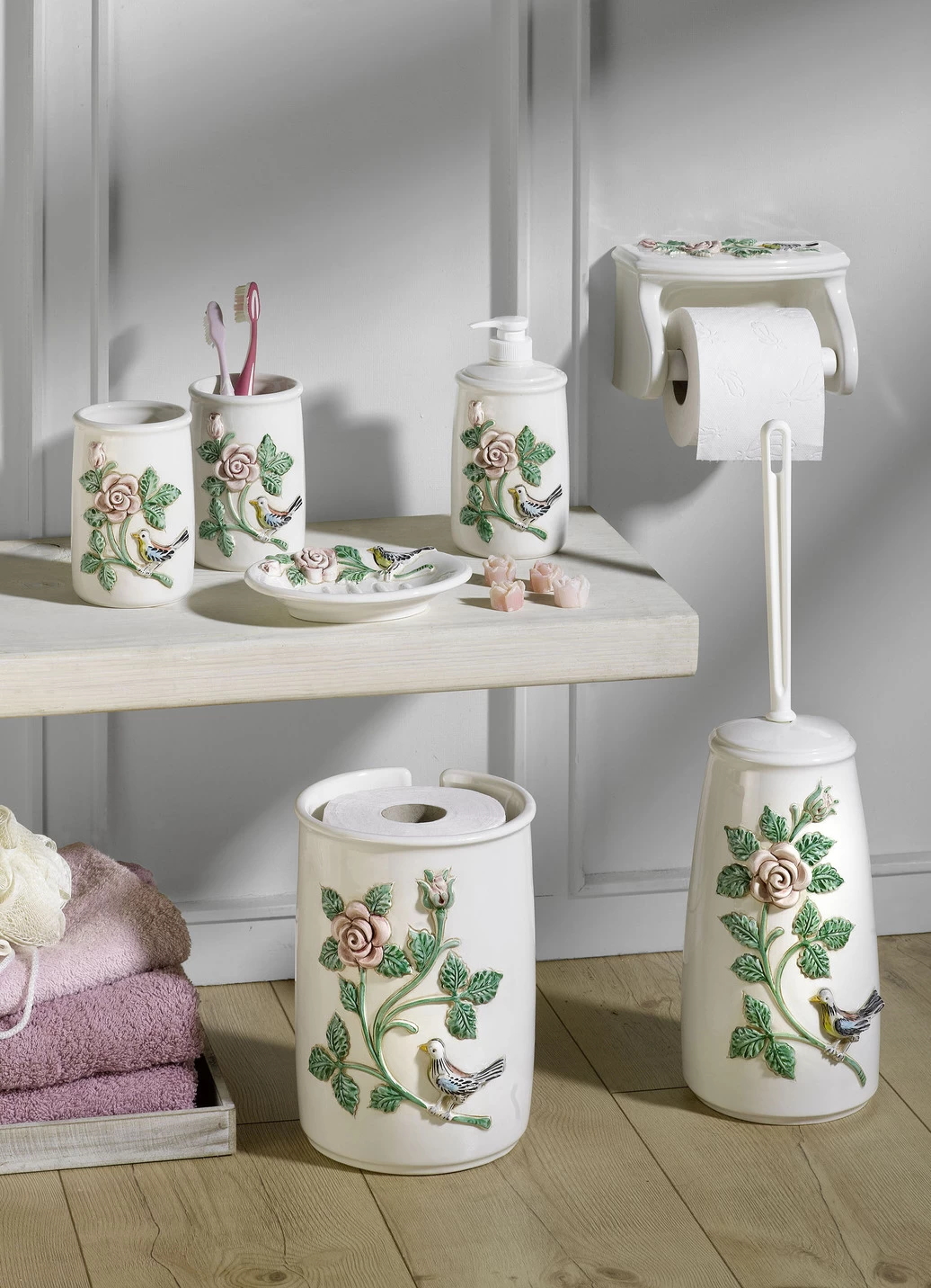 Klassische Badezimmer-Accessoires in floralem Design mit aufwendig aufgebrachten Rosen und Vögeln. Aus hochwertiger Keramik in italienischen Werkstätten in Handarbeit hergestellt und handbemalt.