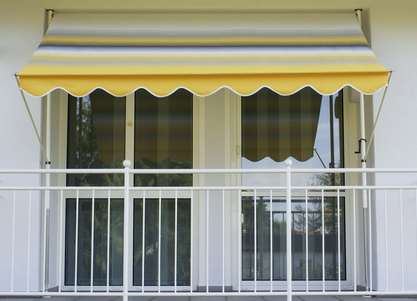 Klemm-Markise mit innenliegendem Kettenantrieb in Größe 150 (Breite 150 cm) und in Gelb-Grau.