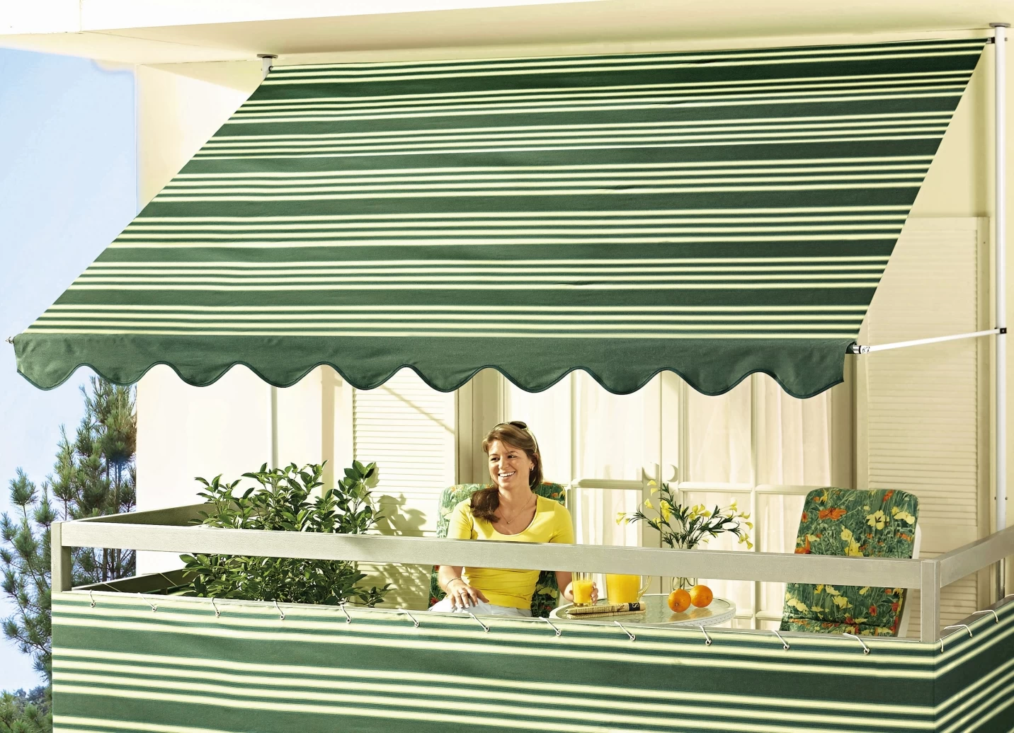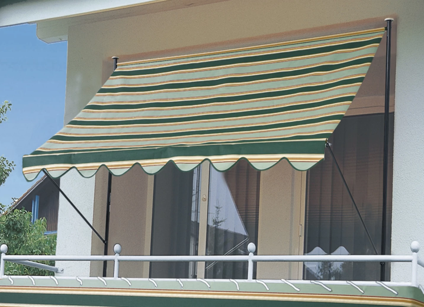 Klemm-Markise mit innenliegendem Kettenantrieb und Kurbel, verzinkten, kunststoffbeschichteten Standrohren, verstellbarem Neigungswinkel und einer verstellbaren Einbauhöhe von 225–275 cm. Ausfallschräge 150 cm. Bezug aus 100% Polyacryl.