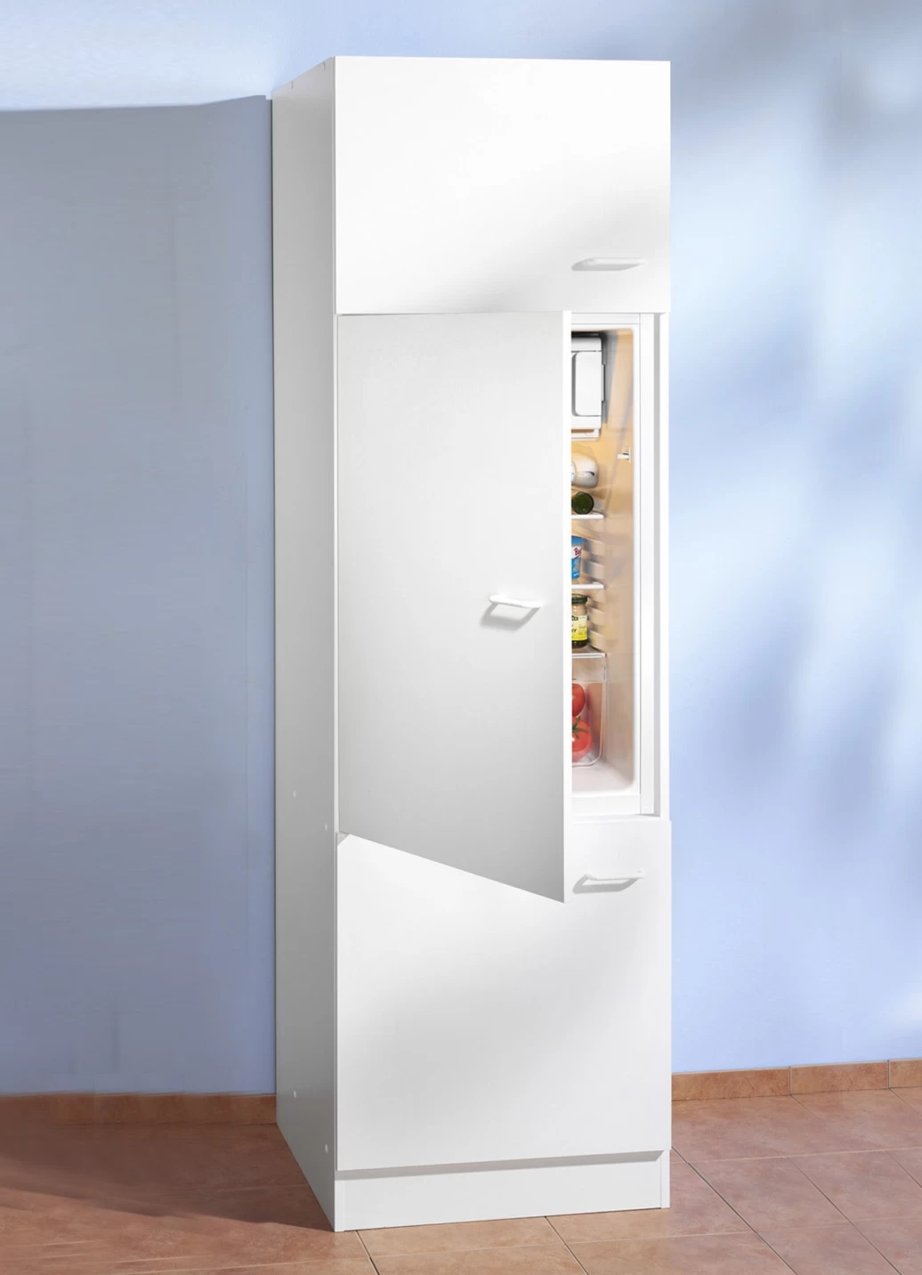 - Kühlschrank-Umbau mit 3 Türen, unten 1 Einlegeboden. Maße: B60xH200xT60 cm, Nischenmaße für den Kühlschrank B57xH88 cm