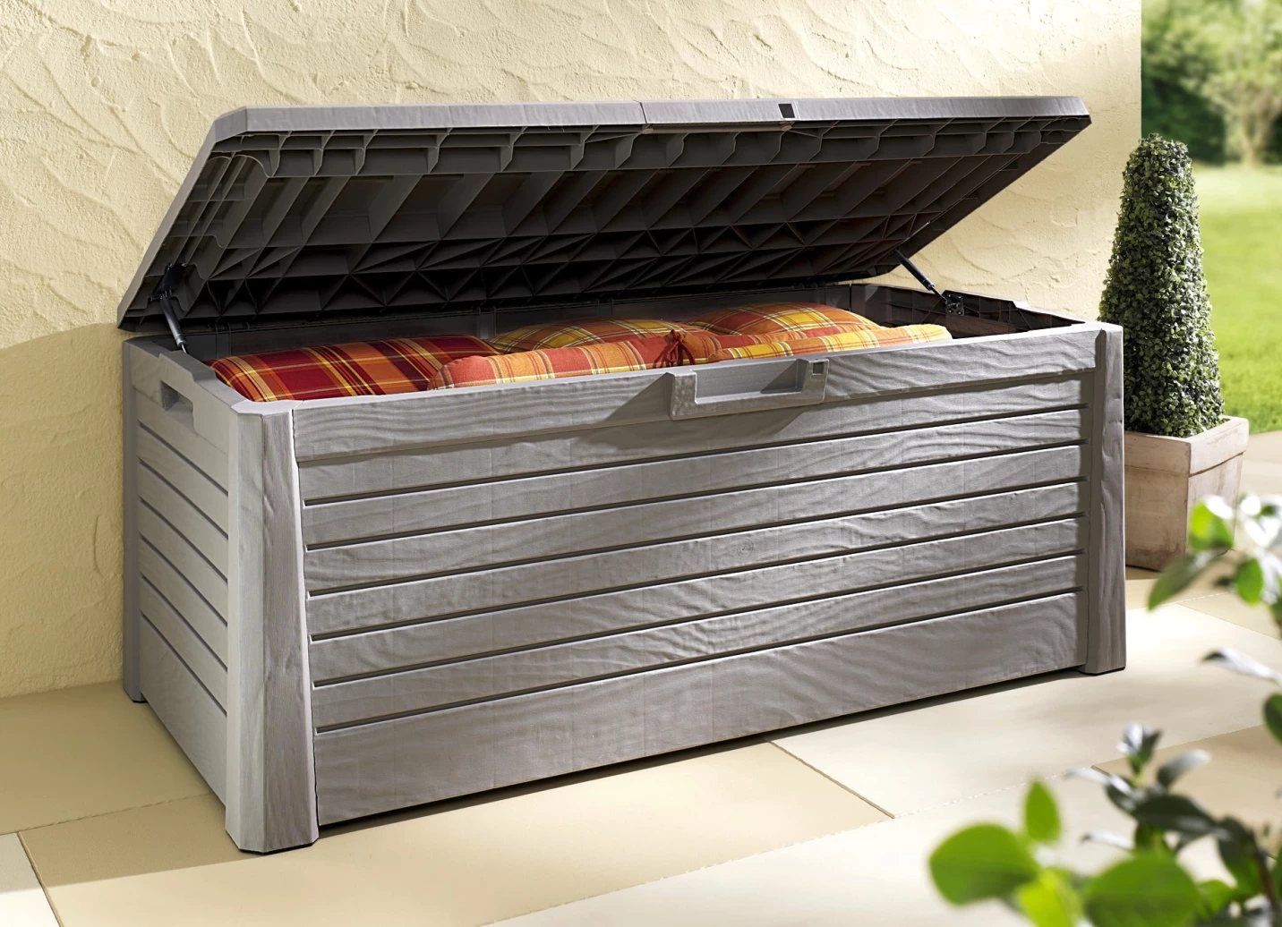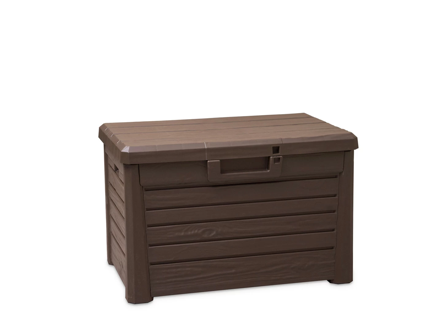 Wohin mit Sitzauflagen, Kissen und Gartengeräten, wenn man sie nicht benötigt? Diese Mehrzwecktruhe ist die perfekte Lösung und bietet viel Stauraum (120 l). Sie ist mit einer praktischen Vorrichtung für ein Vorhängeschloss ausgestattet. Oberfläche in Holzoptik. Aus widerstandsfähigem Polypropylen. Mit Aufbauanleitung. Spritzwassergeschützt. Maße: B73xH46xT50 cm