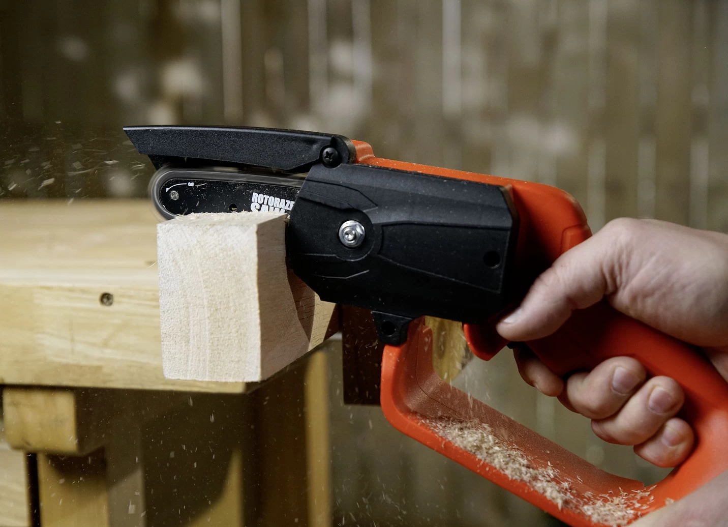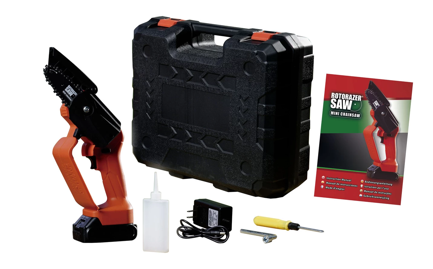 Mit der „Rotorazer“-Mini-Akku-Kettensäge bekommen Sie die Gartenbarbeit in den Griff! Rotorazer bietet ein einzigartiges ergonomisches Design, ist besonders leicht und tragbar und ermöglicht vielseitiges Arbeiten mit hoher Präzision. Der mitgelieferte leistungsstarke Akku (1500 mAh, 31,5 Wh) macht Rotorazer ideal für den Astschnitt und zum Zerkleinern von Gartenabfällen. Ein zusätzlicher Handschutz sorgt für Sicherheit. Inkl. Ladegerät und Koffer. Maße: L40xB18xH11 cm.