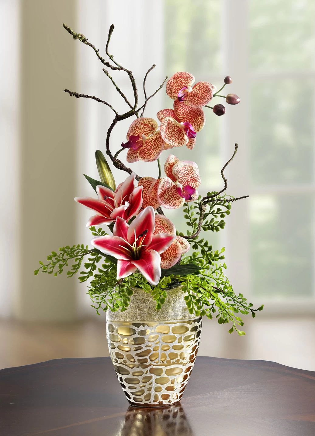 Diese bezaubernden Orchideen aus Kunst- und Textilmaterial sind zusammen mit prachtvollen Lilien und grünem Beiwerk fest in einen weiß-goldfarbenen, gemusterten Topf aus Keramik eingesetzt.