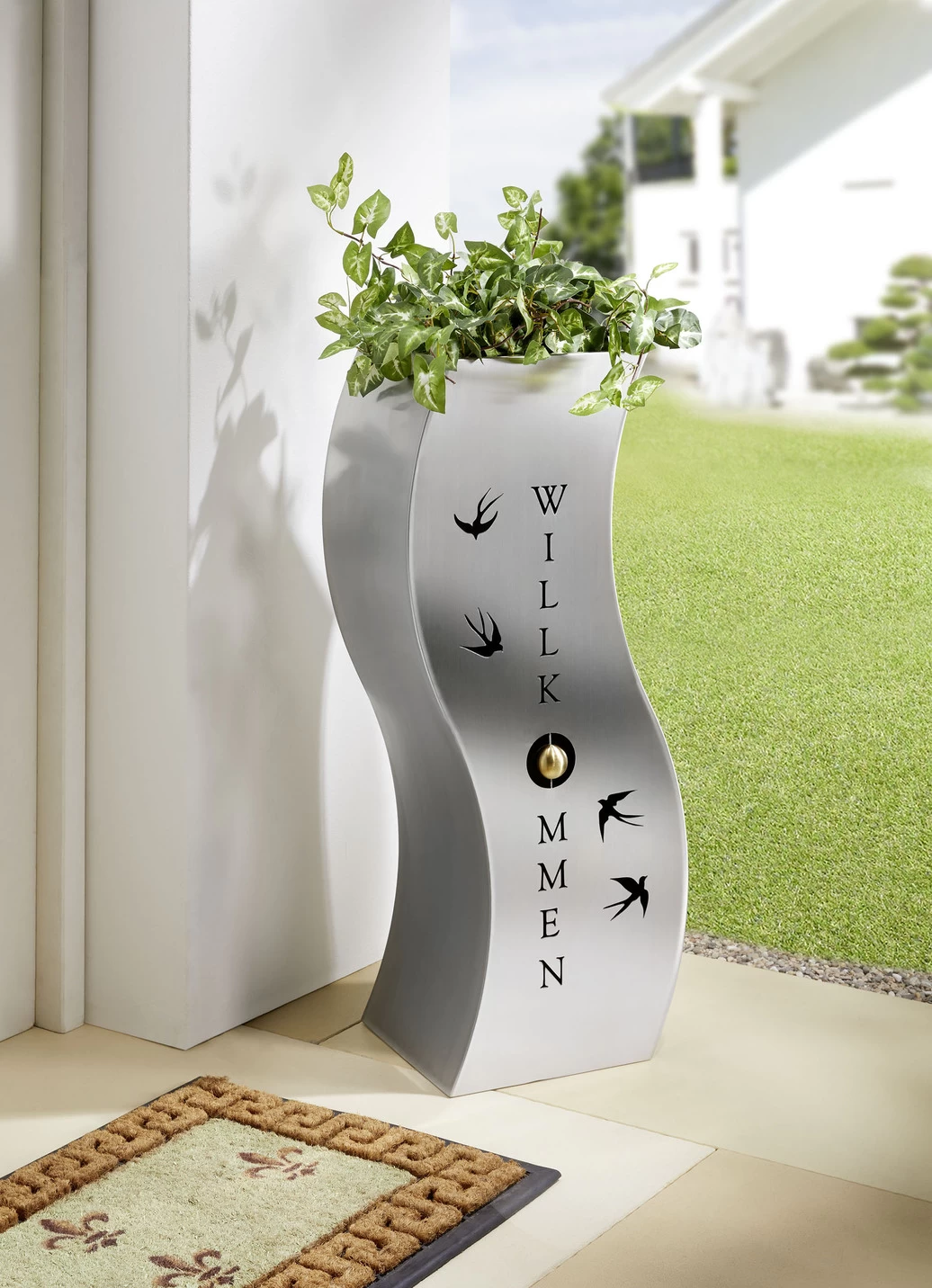 Platzieren Sie dieses Schmuckstück vor Ihrer Haustür und heißen Sie Ihre Gäste „Herzlich willkommen“. Die Säule aus Edelstahl sorgt durch ihr geschwungenes Design für eine stilvolle Dekoration. Durch die Bepflanzung wird die Säule erst recht zu einem Hingucker.