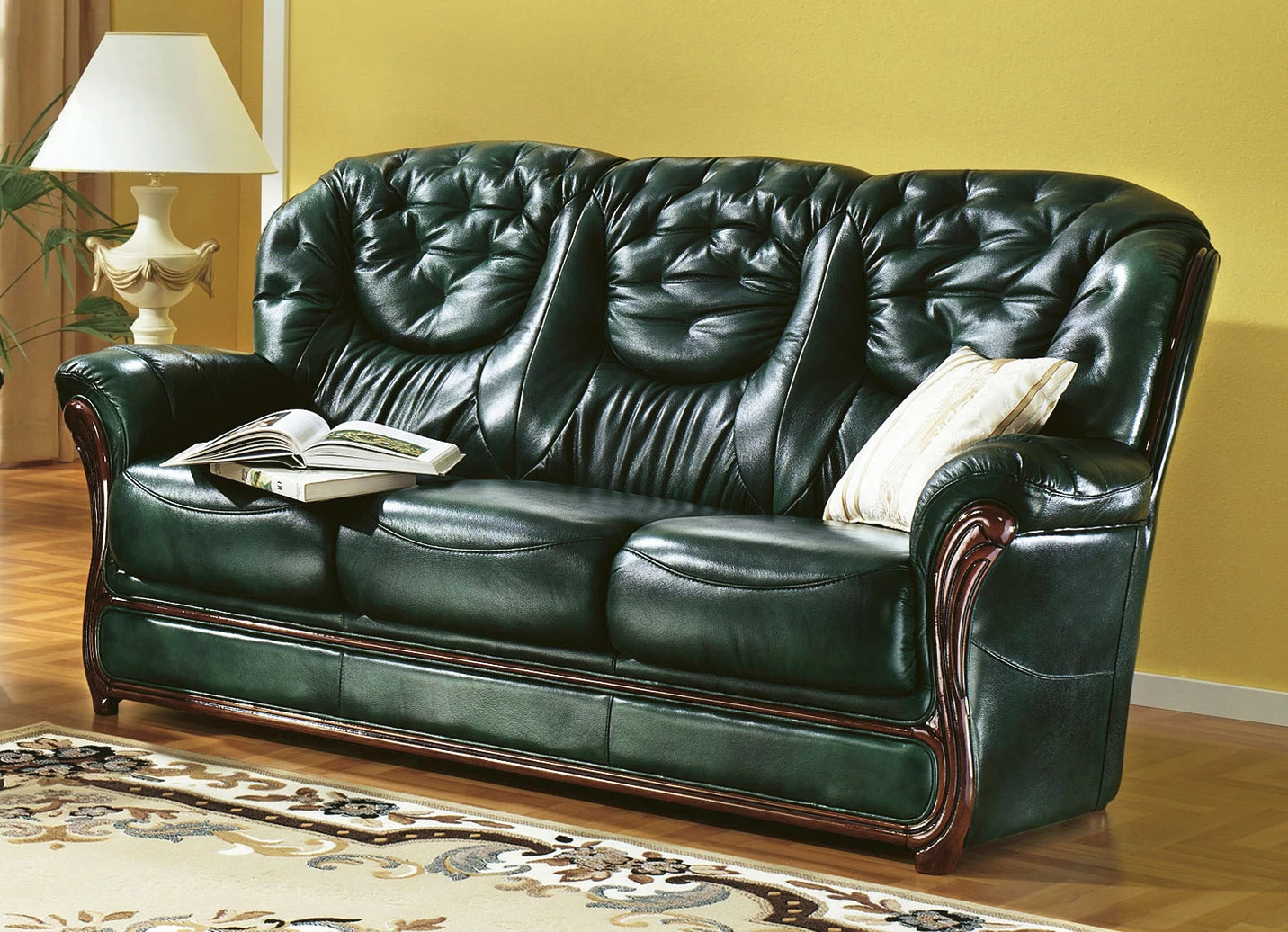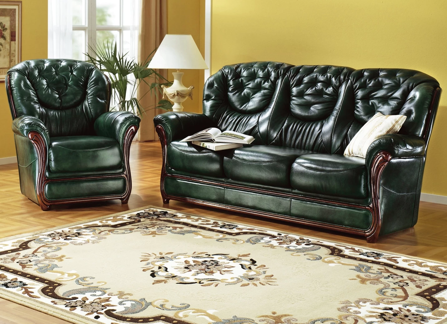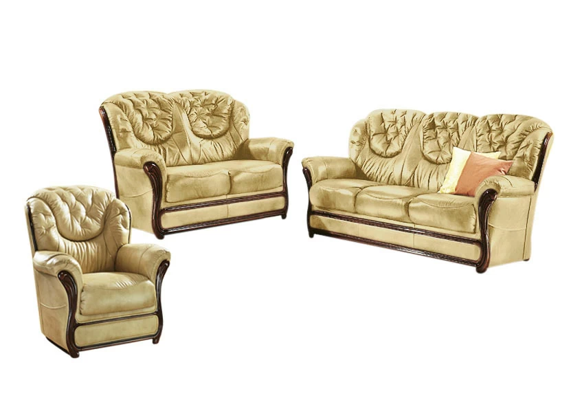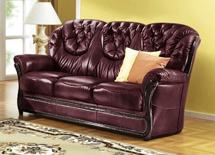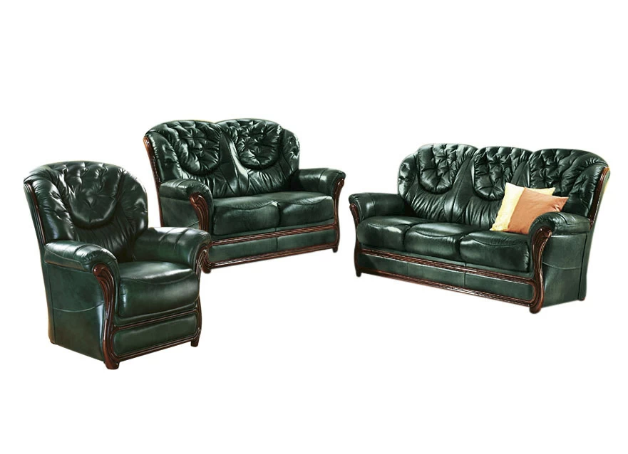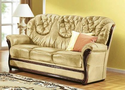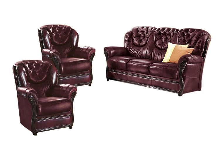 Geschmackvolle und komfortable Polstermöbel mit Bezug komplett aus echtem Leder. Auf stabilem Holzgrundgestell, mit bequemer Polsterung, wertvoll gestepptem Rücken sowie aufwendig gearbeiteten, nussbaumfarben lackierten Holz-Chatosen. Die Sitzkissen sind einzeln herausnehmbar. Rundum mit Leder bezogen, daher frei im Raum aufstellbar. Sitzhöhe 46 cm, Sitztiefe 49 cm.