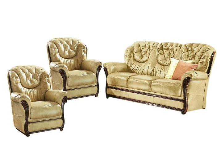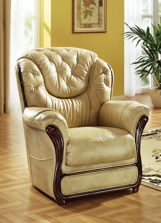 Polstermöbel mit Bezug aus echtem Leder in der Ausführung Sessel und in Antikbeige.