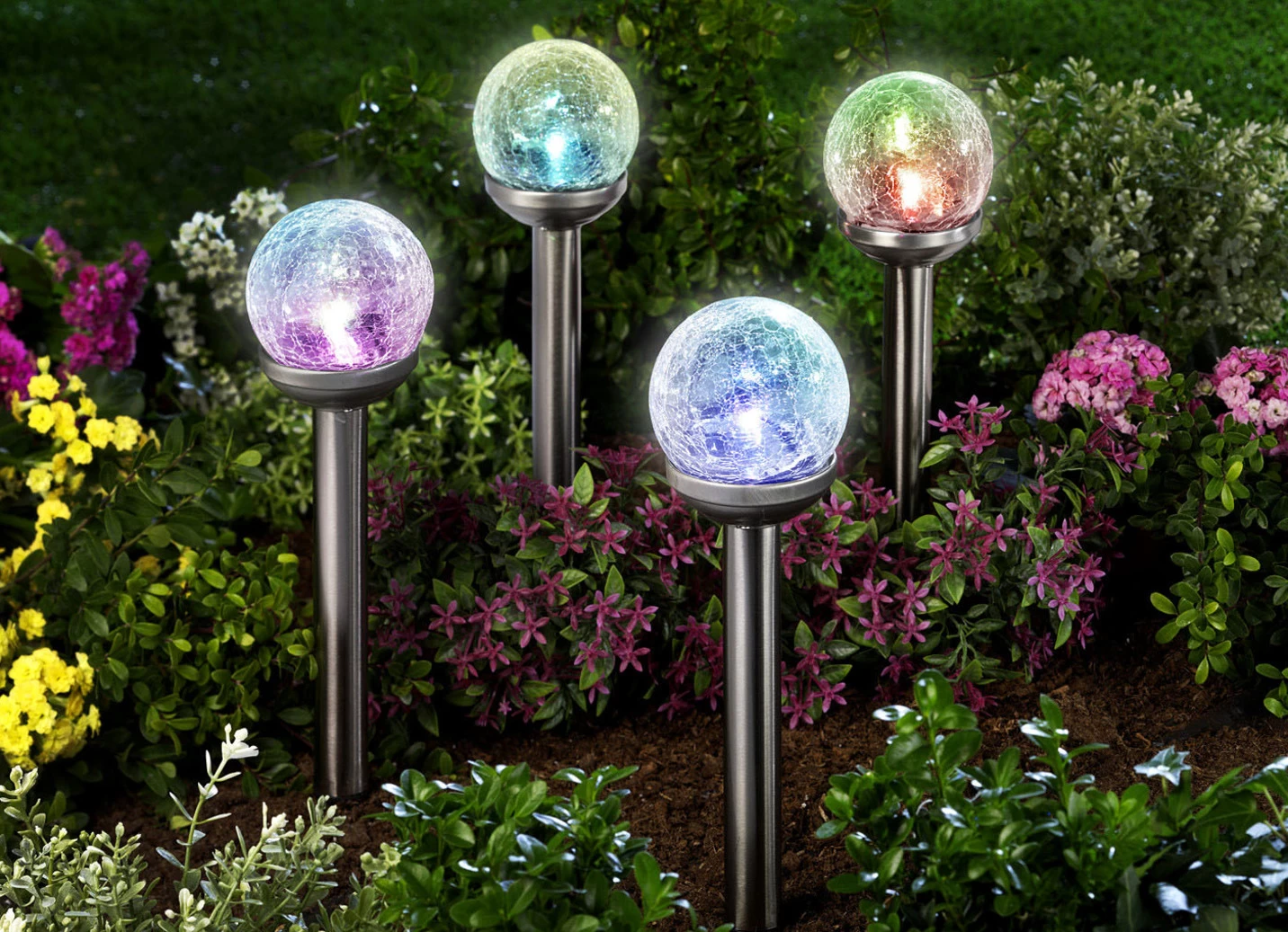 Hochwertiges 4er-Set Edelstahl-Solarleuchten mit krakelierter Glaskugel. Im Inneren jeder Kugel befindet sich eine LED mit Farbwechsel in den Farben des Regenbogens. Der integrierte Akku lädt sich tagsüber auf, nachts wird das Licht über Stunden wieder abgegeben.