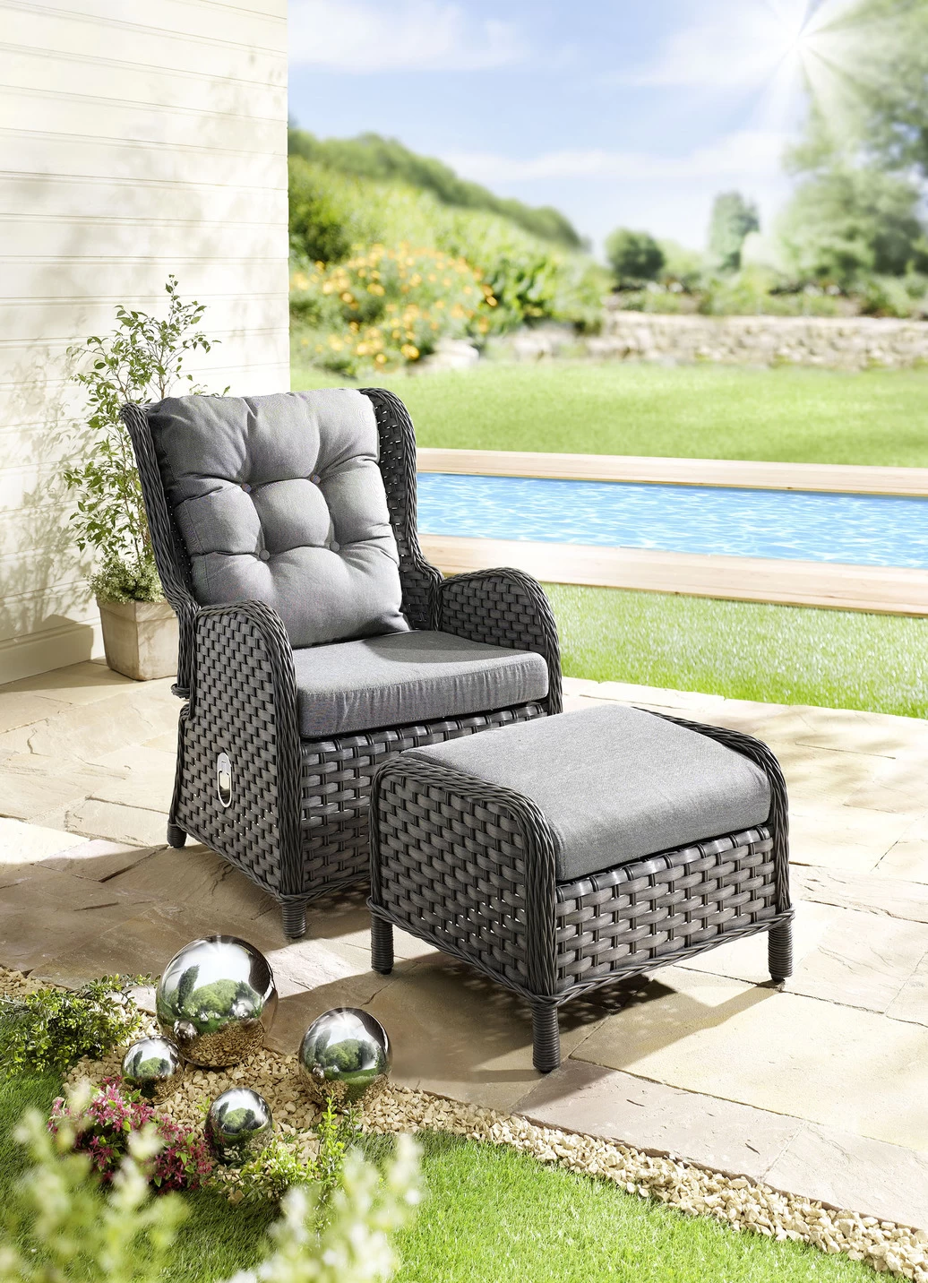 Auf das leichte, stabile Aluminiumgestell wurde von Hand ein witterungsbeständiges Polyrattan-Geflecht aufgebracht. Die 8 cm dicken Sitz- und Rückenkissen (100% Polyester) sind im Lieferumfang enthalten. Das Rückenteil ist per Gasdruckfeder kinderleicht und stufenlos verstellbar.