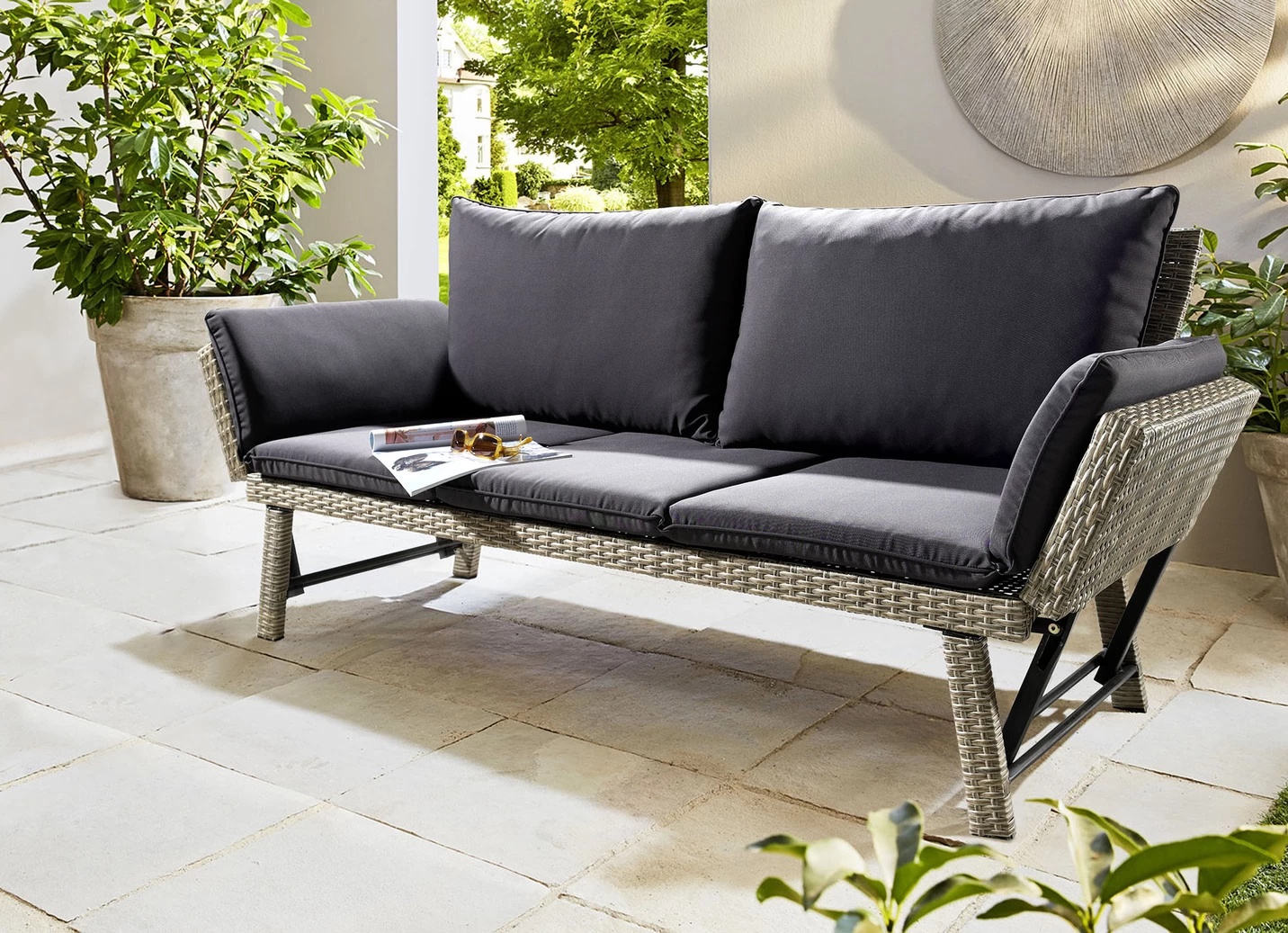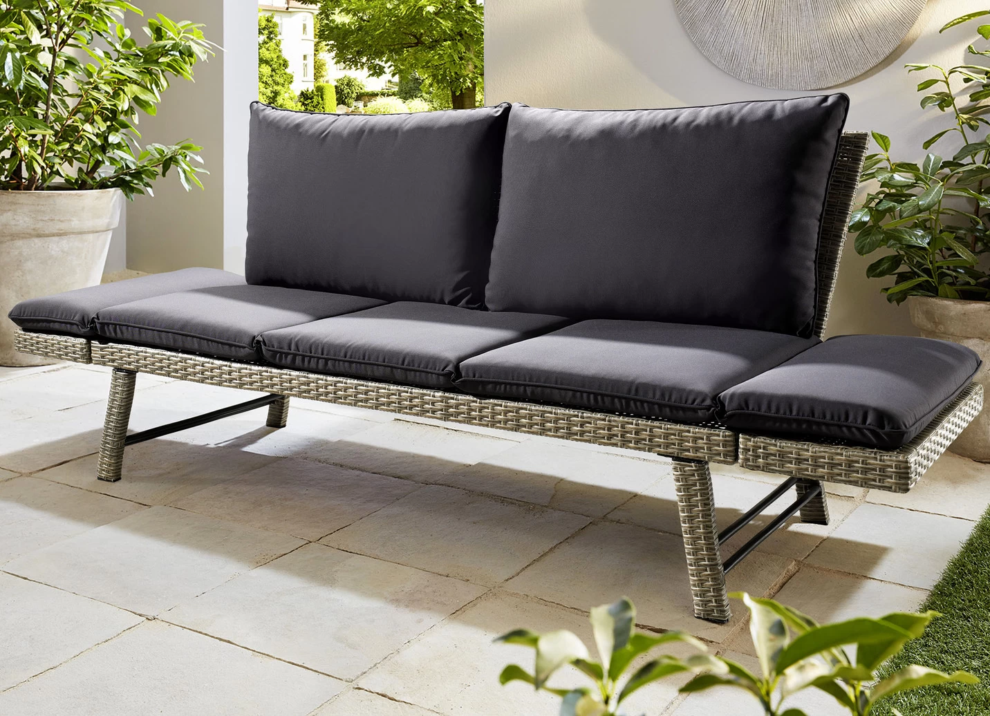 Gibt es etwas Schöneres als auf einer Gartenbank, die Sie einfach zum Bett umfunktionieren können, in der Sonne zu entspannen? Mit dieser Schlafbank kein Problem, denn durch einfaches Umstecken der Armlehnen entsteht eine großzügige Liegefläche (210×60 cm). Auf ein stabiles Stahlgestell wurde ein braunes Kunststoffgeflecht gearbeitet.