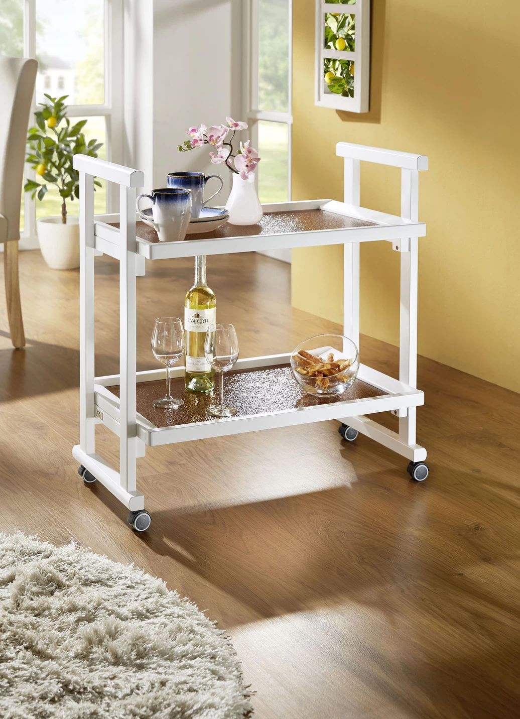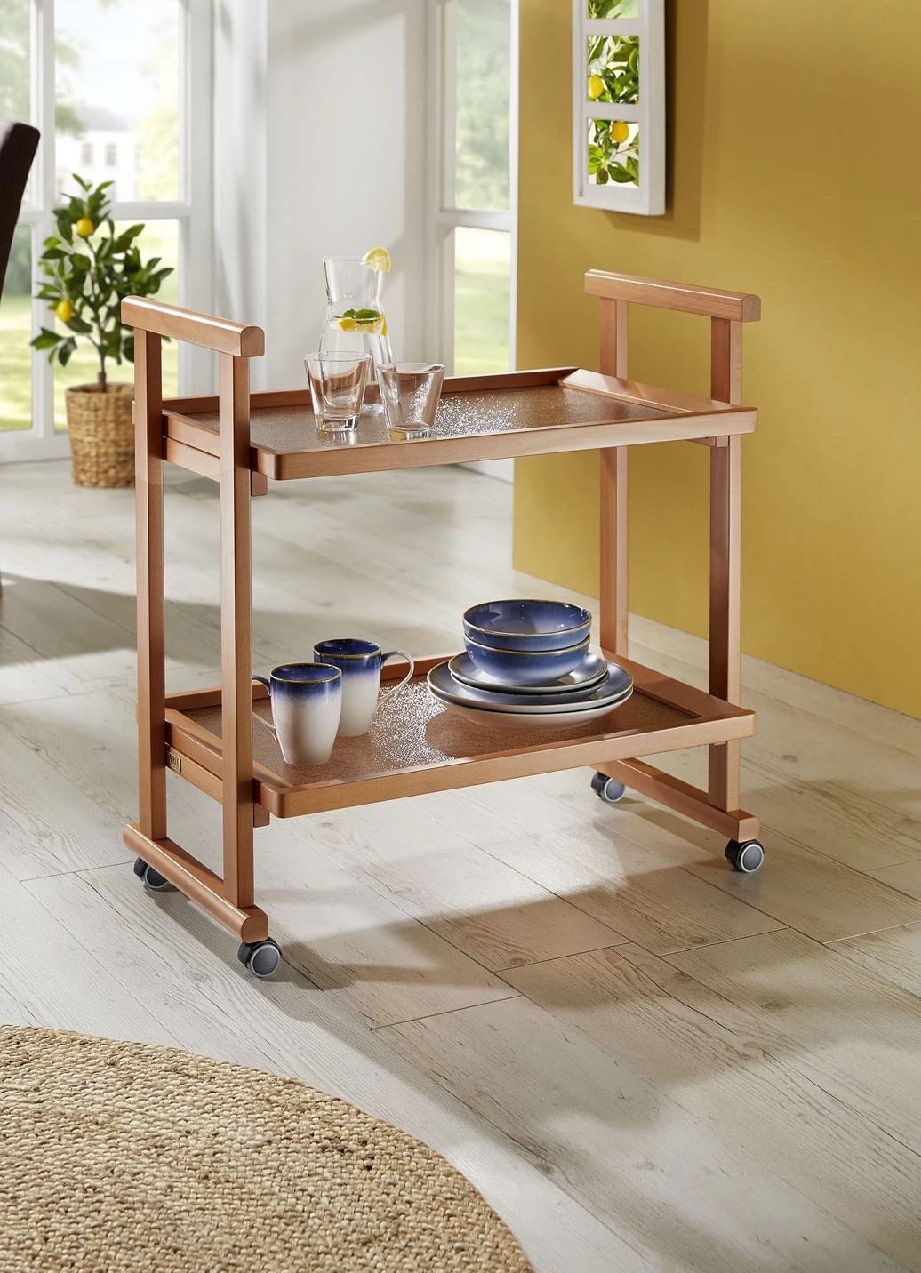 Superpraktischer und raffinierter Servierwagen aus massivem Buchenholz. Mit 2 stabilen, festen Böden aus synthetischem Rauchglas (maximale Tragfähigkeit 20 kg über die gesamte Fläche verteilt). Einfach zu bewegen dank der 4 drehbaren, kratzfesten Rollen.