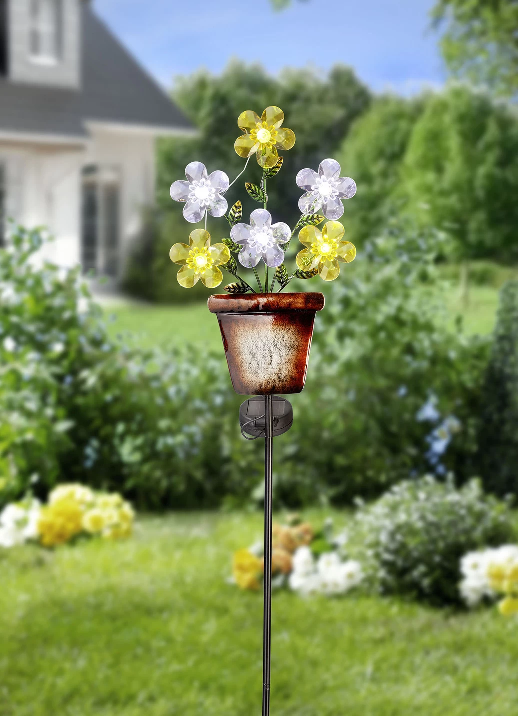 Originell, dekorativ und pflegeleicht. Dieser „Blumenstrauß“ verwelkt nicht und bedarf keiner weiteren Pflege. Tagsüber speichert das Solarmodul das einfallende Tageslicht. Die 6 LEDs lassen die Kunststoffblüten bei Dunkelheit erstrahlen. Aus Metall. Maße: Gesamthöhe 90 cm, Breite 19,5 cm.